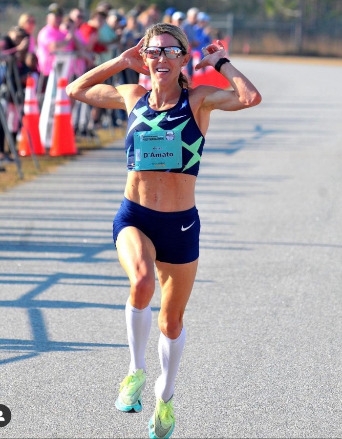 Hardeeville, SC, Mortgage Network Road Races Half Marathon, USATF Half-Marathon Championship, December 5, 2021—Keira D’Amato of Richmond, VA, at 37, won her first USATF championship. D’Amato had a convincing win, earning a personal best, a course record, and a big win. D’Amato, who broke away early in the race, was just eleven seconds off the 1:07:44 USA record for an all-women’s race, set by Molly Huddle.