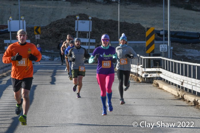 Jacobus, PA, February 5, 2022—The York Winter Series is in it’s 42nd year, and the Jacobus 5 miler has been a mainstay since the start of the series in 1979. This year was the last running across the Water Street Dam/Bridge, which will be replaced with a different construction. Water Street has been closed to vehicles for several years, and recently has been closed to foot traffic as well. The YRRC received special permission from the York Water Company to run the Jacobus 5 miler across the bridge and back for the last time. In my racing years, I always enjoyed the challenge of the hilly course. Future years will have an altered or shortened course, as construction of a new dam will start soon. Most of runners were rather bundled with 23 degrees and a brisk north wind.
