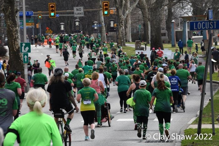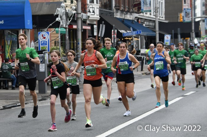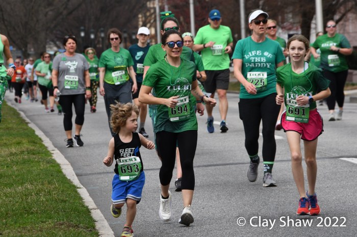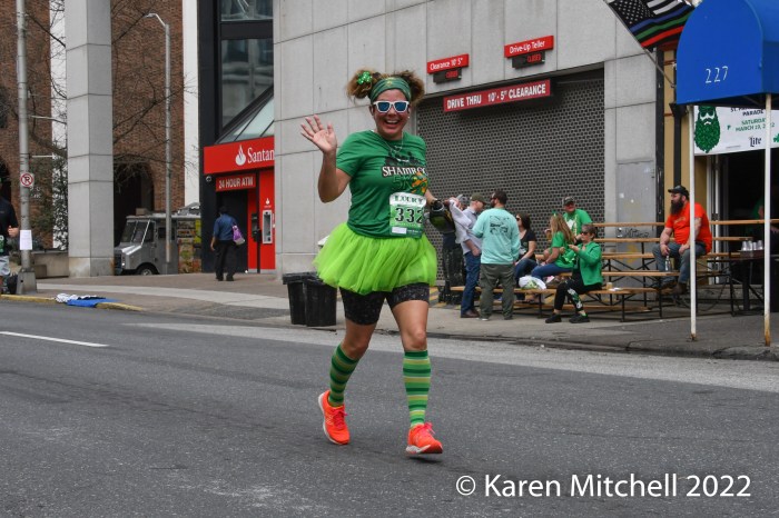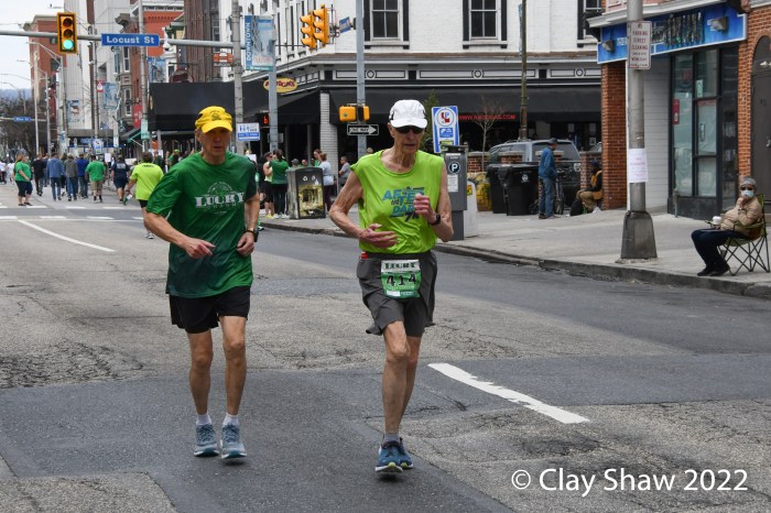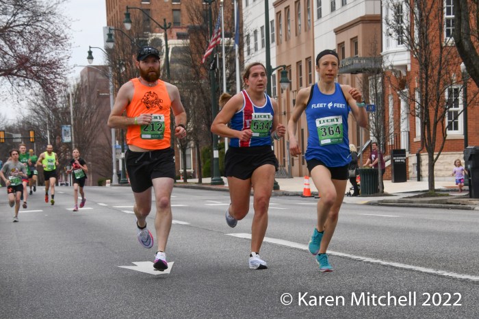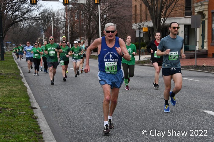 Harrisburg, PA, Lucky Charm 4 Miler, March 19, 2022—While neither winner Zoë Matherne or Trevor Conde wore green, most of the 648 finishers did. The Harrisburg St. Patrick’s Parade followed the new 4-mile race. In past years (2019, and prior) it had been a combo 10K/5K event. In 2020 there was no race, of course. In 2021 it was held on both weekend days on the river.