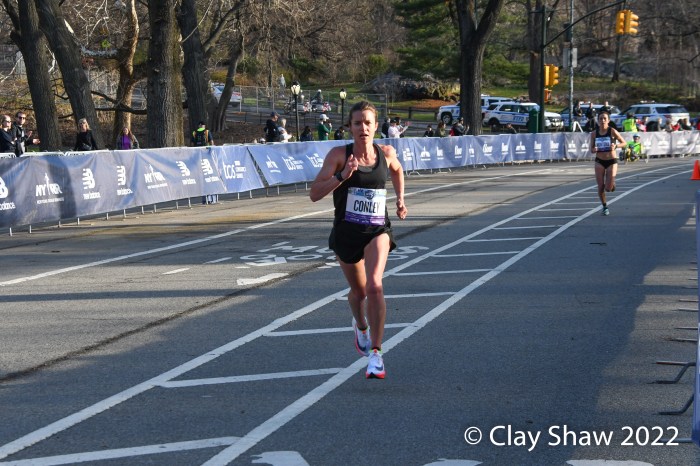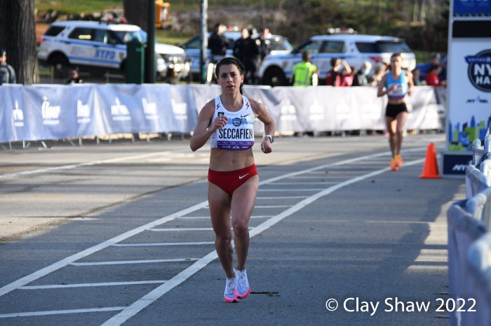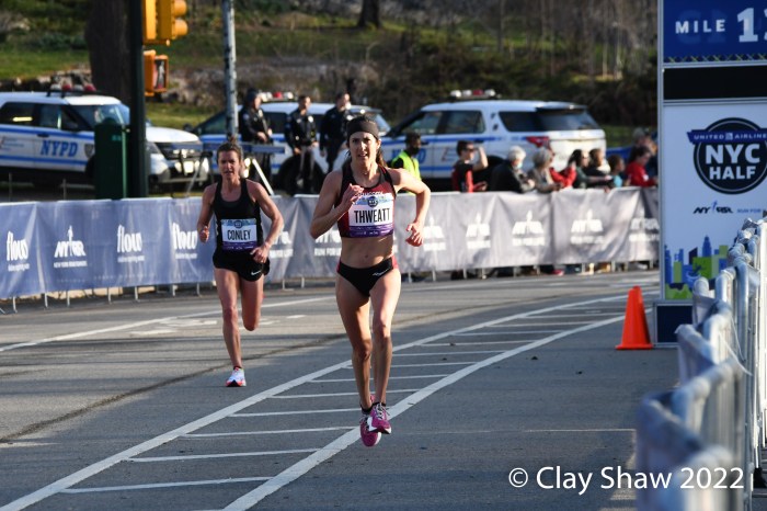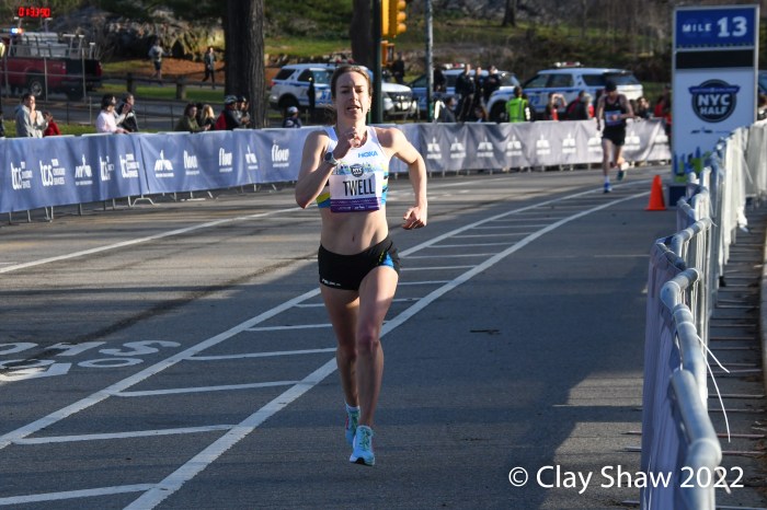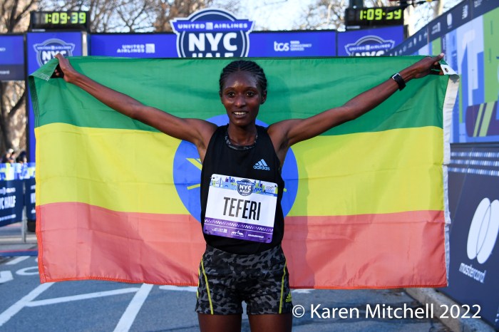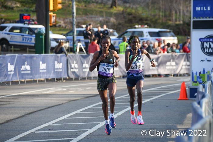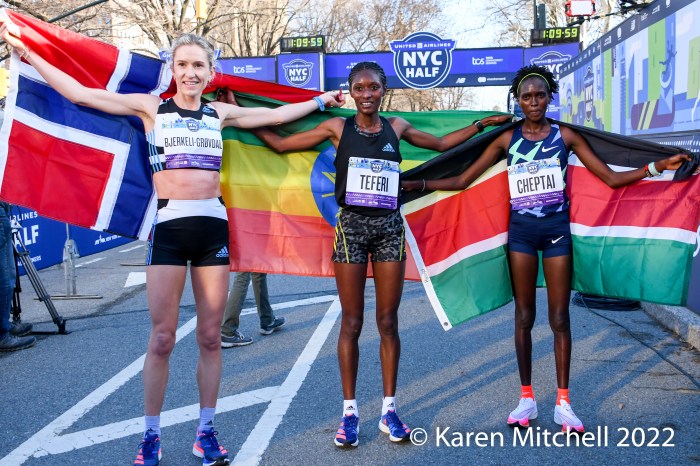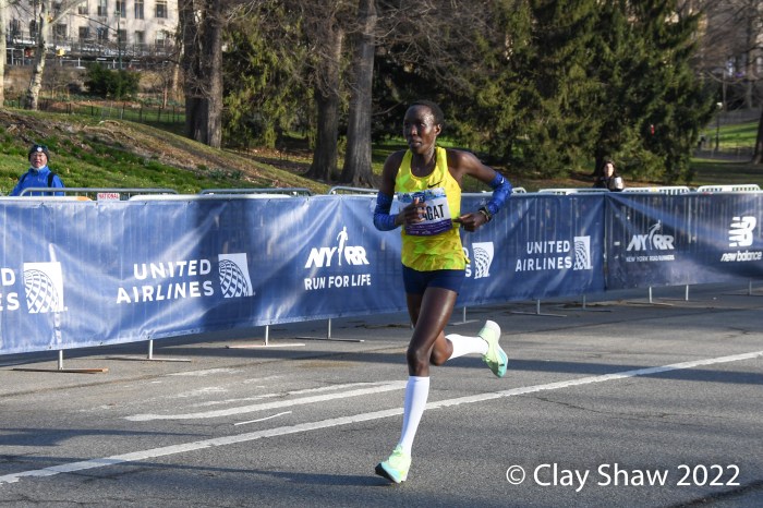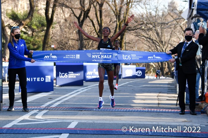 New York City, NY, March 20, 2022—Senbere Teferi of Ethiopia waited to the final steps to pull free of Irine Cheptai of Kenya, to win the United Airlines NYC Half-Marathon in 1:07:35. Teferi set a new event record of 1:07:35. Cheptai was just two seconds back in 1:07:37. European XC Champion Karoline Bjerkeli-Grovdal of Norway was third with a personal best of 1:08:07. Sharon Lodeki of Kenya was fourth in 1:08:14 a PB. Lindsay Flanagan of Boulder was fifth and top USA in 1:09:50. Natasha Wodak of Canada was seventh and top master in 1:10:01.