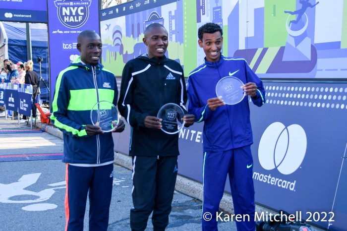 Rhonex Kipruto of Kenya won in 1:00:30. It was not an event record, but a course record for the Brooklyn to Central Park course. Edward Chesarek of Kenya earned a personal best of 1:00:37 and placed second. Teshome Mekonen of Ethiopia was third in 1:00:40. Shadrack Kipchirchir of Colorado Springs, CO was fourth USA in 1:01:16 in his debut at the half-marathon distance. Connor Mantz of Provo, UT was fifth in 1:01:40. Five-time USA Olympian Abdi Abdirahman was top master in 1:06:41.