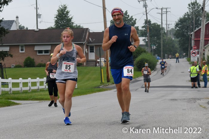 Jayden Craig of Westminster, MD was second in 17:48. Austin Strickler of York was third in 17:54. Peyton Small of Littlestown was fourth in 18:04. Mason Meads of Red Lion was the fifth male in 18:20. Eric Yurick of East Berlin was top master in 21:11.