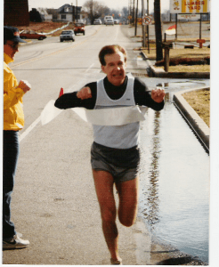 Herb Townsend breaks the tape at the 1990 Great Valley Marathon.