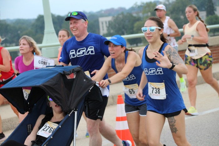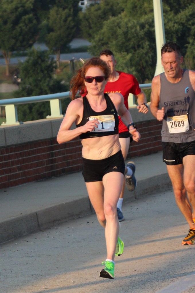Going into the fourth mile the runners faced the 80-foot span bridge over the Severn River which replaced a flat bridge in 1994. The lead runner up the bridge was Samuel Doud of Washington. The leading female at the bridge was Julia Roman-Duval of Columbia, MD. Roman-Duval is the only four-time female winner. The balance of the race was to determine if number five was going to play out. The challenging part of the course was the remaining miles until the return to the bridge after mile 7.