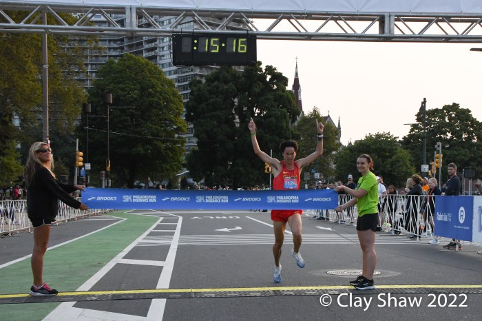 Jordan Hasay of San Luis Obispo, CA was a surprise entrant in the Philadelphia Distance Run’s companion 5K race. She won in 17:32, and then changed numbers quickly and ran the half marathon. Georganne Watson of Phoenixville, PA was second in 17:35. Ersula Farrow of Philadelphia was third in 17:37. Jocelyn Chau of Philadelphia was fourth in 17:40. The top four women finished eight seconds apart.