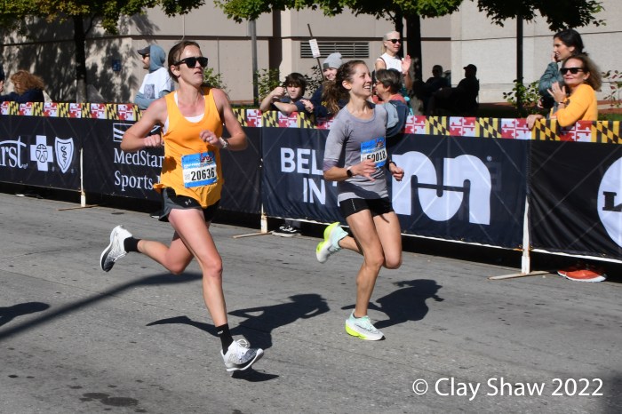Mary Lambkin of Vienna, VA was credited with the win in 1:24:40 (gun time) and 1:24:23 (chip time). Lara Rogers of Baltimore was credited with second in 1:24:37 (gun time) and 1:24:33 (chip time). Our photos have them locked in as they sprinted for the finish. Caryn Just of Baltimore was third in 1:25:35.