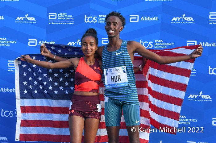 With an extremely competitive field, Flagstaff, AZ residents Weini Kelati and Abdihamid Nur both won rather easily. Kelati, who was born in Eritrea and ran for the University of New Mexico, won in 15:14, successfully defending, and improving on, her 2021 title. Nur was born in Mogadishu, Somalia and raised in Phoenix, AZ; he won in 13:24. He would have had a larger margin of victory, had he not almost followed a race vehicle off course. Nur, who ran at University of Northern Arizona, laughed off the near miscue, and appreciated having won the race.
