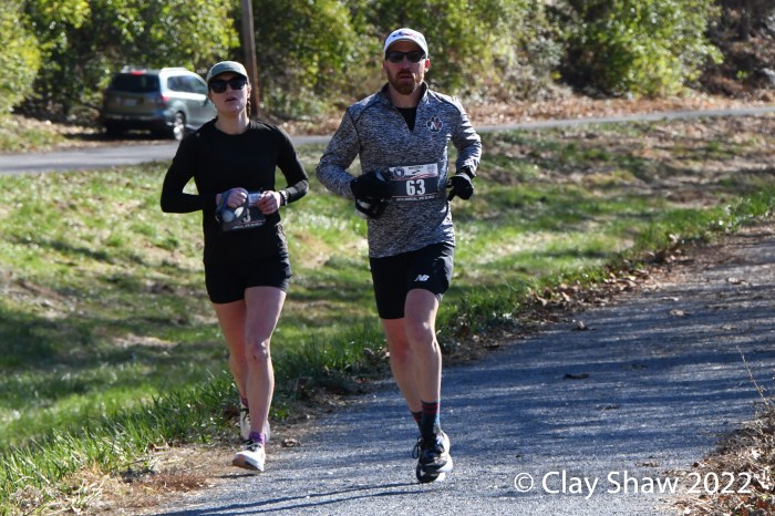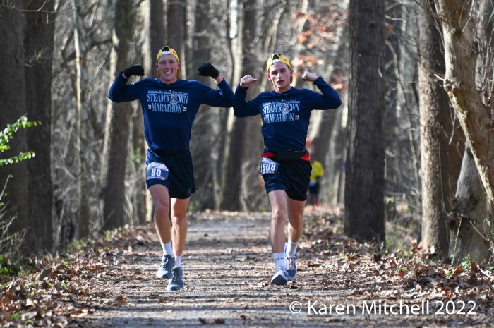 Scott Nickley #71 of Los Angeles leads Israel Merkle #15 of Akron, OH at Taylor’s Landing. Nickley was 17th in 6:26:08 and Merkle was 18th in 6:26:55.