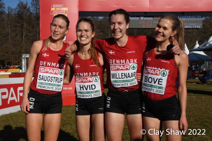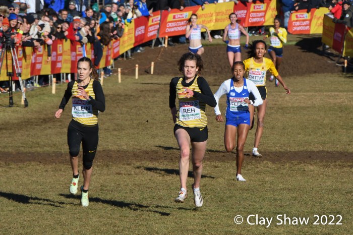Grøvdal, Klosterhalfen, and Yasemin Can of Turkey broke away from the field mid-race. The 2021 Dublin Euro XC champ and Klosterhalfen, the 2022 European 5000-meter champion, distanced themselves from Can, who dropped out. Grøvdal won in 26:25 earning the gold. Klosterhalfen was a strong second in 26:29. The bronze was up for grabs 50 seconds later, as Alina Reh of Germany, just edged teammate Hanna Klein, for the bronze. Reh, who was third in Dublin, and Klein were both timed in 27:19. Selamawit Teferi of Israel was a close fifth in 27:20.