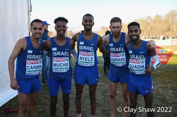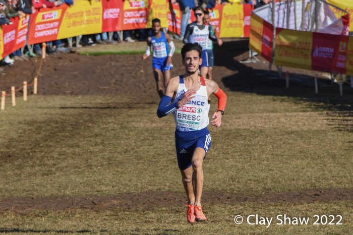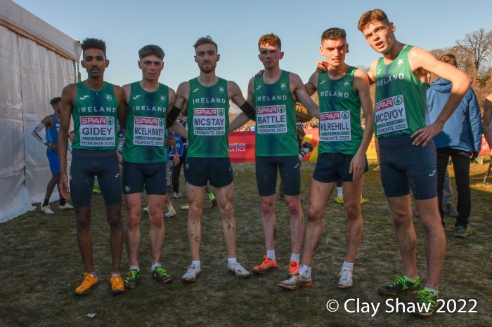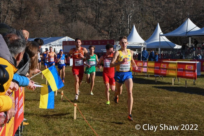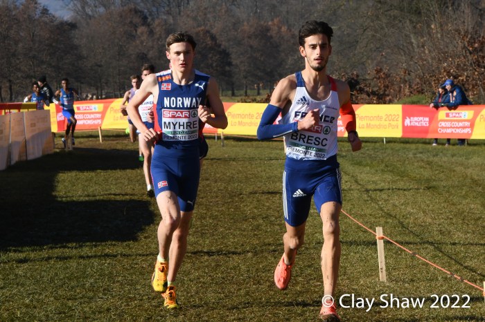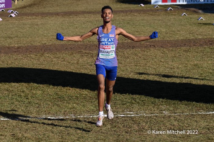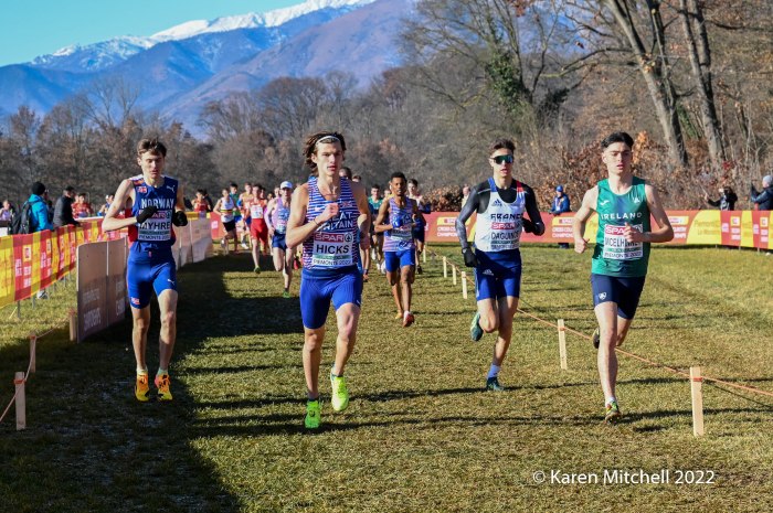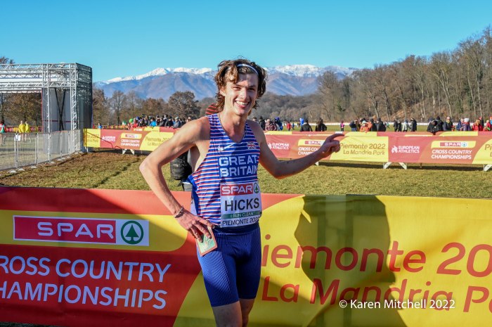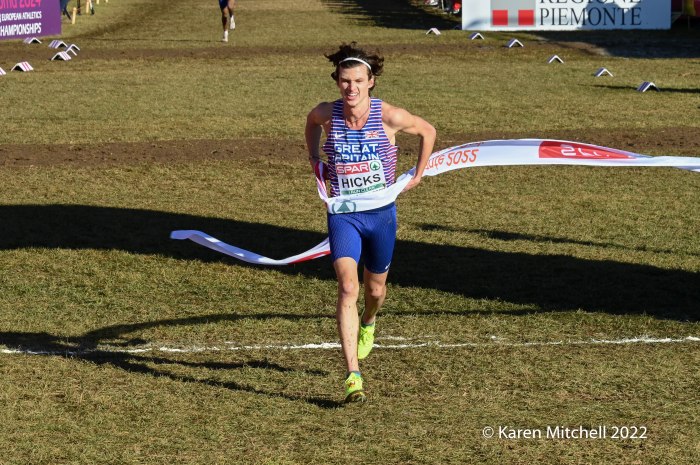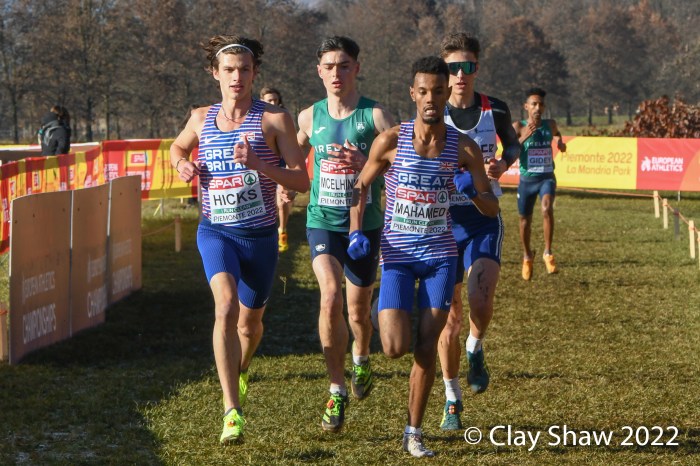 Turin, Italy, December 11, 2022, SPAR Euro Cross-Country Championships, (U23, 7.662KM) Piermonte La Mandria Park—Charles Hicks of Great Britain repeated as U23 champion winning in 23:40. Hicks, who was the NCAA XC champion in November running for Stanford University, had a few moments to catch his breath and greet teammate Zakaria Mahamed who took second in 23:48. Mahamed and Hicks were running together having separated from the rest of the field by the bell lap. Hicks took the lead for good on the final lap. Matthew Stonier of Great Britain finished eighth, giving Great Britain & Northern Ireland the team title in a competitive team race with France. Hicks said at the press conference at the spectacular La Venaria Reale, his thought on not moving to the senior race, was not only to win, but to lead his team to the team gold as well.
