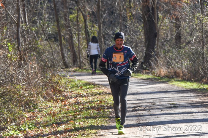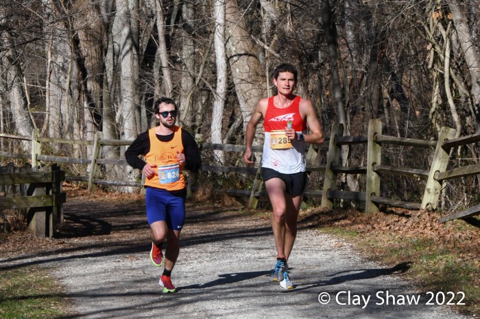 The two were going to settle along the trail this year and they were joined by Patrick Blair of Catonsville, who placed first master in 2021 (2:41:51) who was in the mix. The race does not start until after the turnaround. Each runner has an eye on their competition.