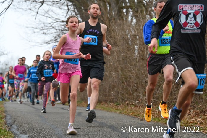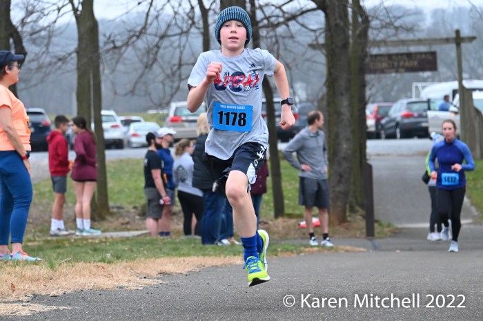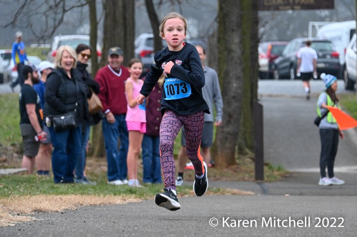 Lyla Eltz won the mile, too; her time was 6:11. Lyla’s sister Lorelei Eltz age 8 ran 7:32. 131 runners did the mile event, with many doubling-up and doing the five miler as well. Kaleb Kabakjian of Conestoga, PA was the champ in 5:35.