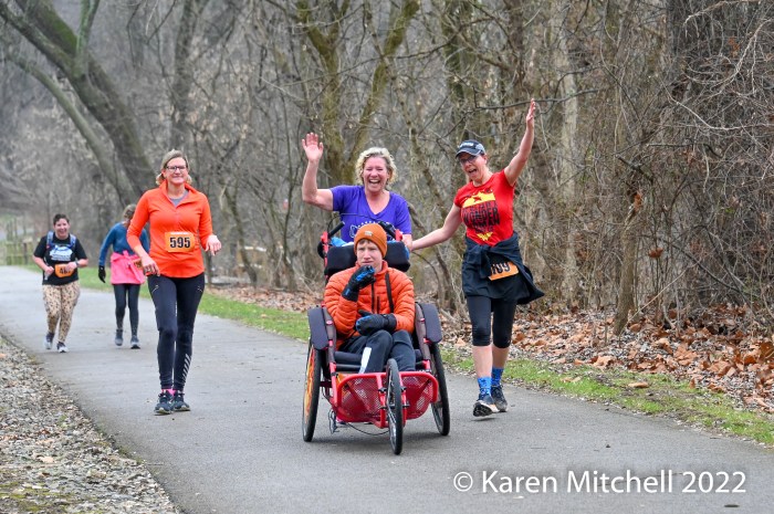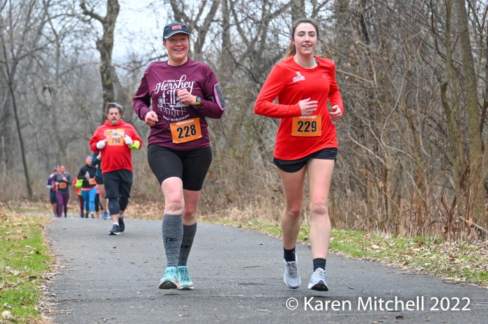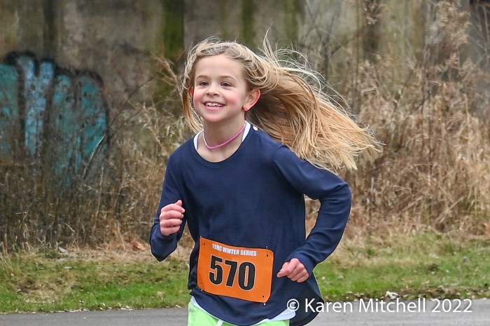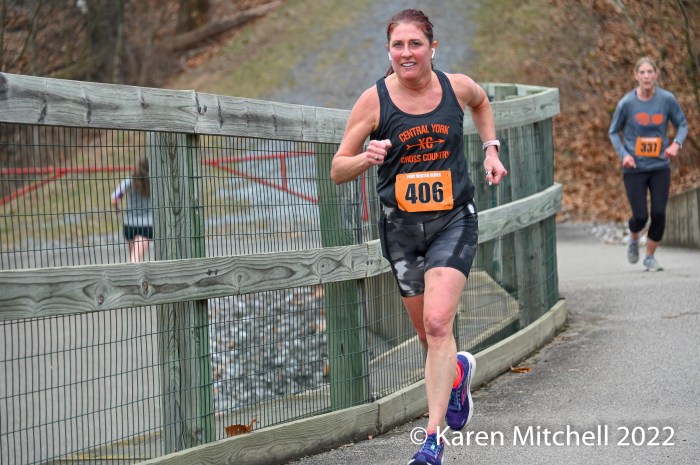 Emigsville, PA, December 31, 2022—Lyla Eltz, 12, of Hanover has been running the York Winter Series races for years and has been improving from running the mile races to running 5Ks and 5 milers. Lyla rocked a 31:51 to win the women’s division of the Rudy Park 5 Miler. She won by over a minute, with talented women runners joining her on the podium. Only seventeen men of the 281-runner field finished ahead of Lyla. Rebecca Doner of Mt. Wolf, who lives nearly on the course, was second in 33:00. Lindsay Pridgen of Harrisburg was third in 33:15. Both women are Boston Marathon veterans. Additional young women (teenagers) placed fourth and fifth, as Leah Navarro of Seven Valleys was fourth in 33:53 and Nicole Register of Jacobus was fifth in 34:07. The first master was Sarah Huss Wenger of Dallastown who was seventh overall in 35:04.