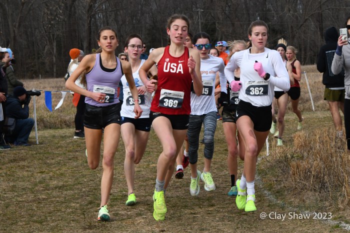 Leaders after completing the first 2K loop. Abbey Nechanicky #362, Irene Riggs #372, Ellie Shea #345, Zariel Macchia #369 and Eva Klingbell #355 already in charge of the U20 race.