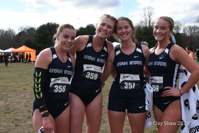 Utah State women in the U20 race. Carissa Hofeling #358, Morgan Nygren #359, Sarah Ellis #357 and Hazel Baird #356.