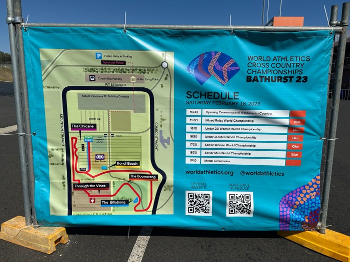 Bathurst, Australia, February 17, 2023—It’s really far away, and it’s been a long wait. We lost a day flying to Australia from Philadelphia. Covid-19 postponed the event from 2021 to 2022, and finally to 2023. Even from Sydney, track work caused a train and bus scenario. Bathurst is the first settlement west of the Blue Mountains. Yes, gold was found here. Now the athletes are here and looking for gold. It’s the 44th running of World Athletics World Cross Country, and it’s been almost four years since the last running in Aarhus in March 2019. The Mount Panorama course is hard, and it’s hot, and there is virtually no shade. It should be great.