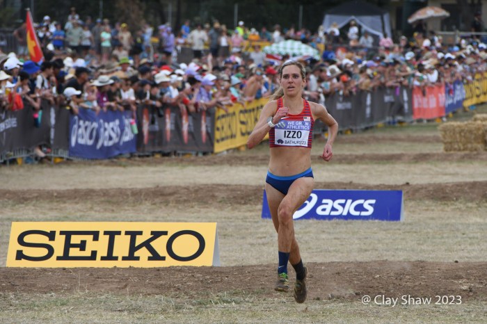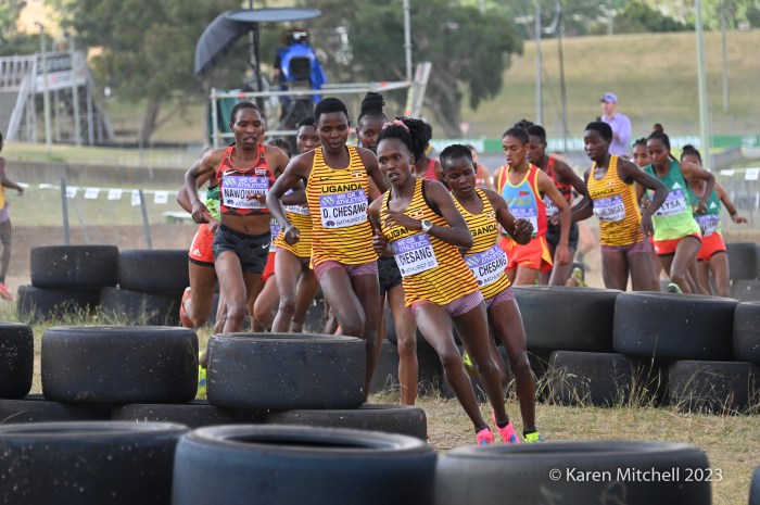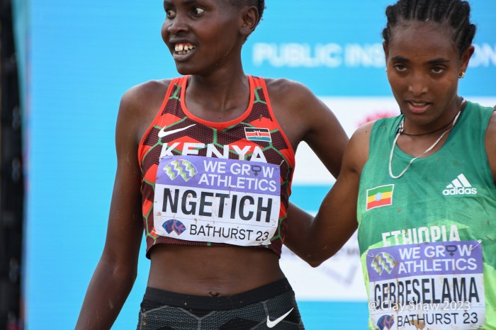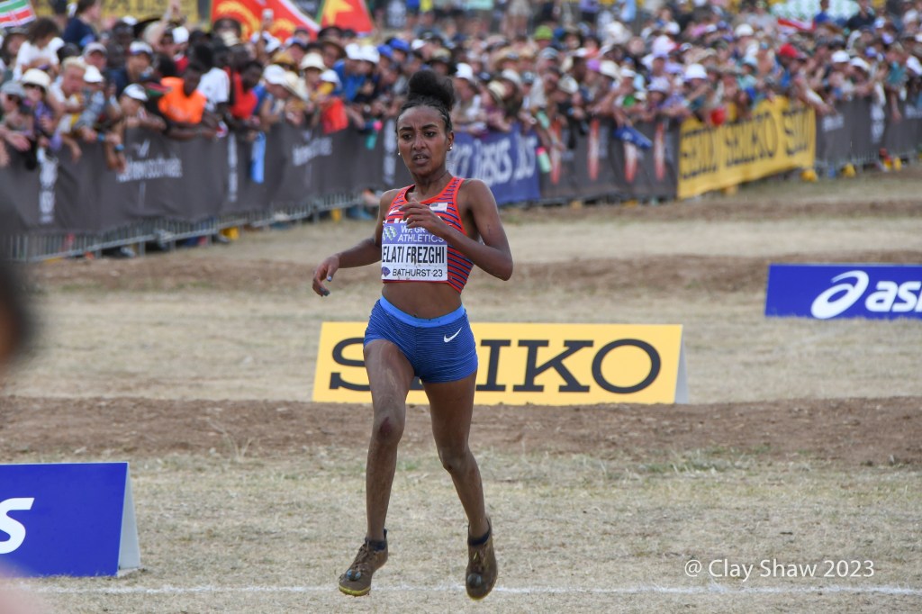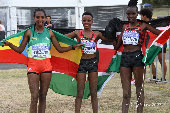 Letesenbet Gidey of Ethiopia, the world record holder in the 5000 and 10,000 meters and half-marathon distances, was well on her way to win her first World Cross senior title. Unseen by many, Gidey ran into a lapped runner in “the chicane,” an area of big racing-car tires and a hairpin turn approximately 200 meters prior to the finish line. Still, she maintained her lead coming down the finish, but began to slow and did not run the tangent near the hay bales. Chebet, who cut the tangent at the top of the hill with a long, hard, dedicated sprint caught Gidey with 20 yards to go. Gidey then collapsed, at which point two coaches jumped onto the course and helped Gidey to her feet. Tsigie Gebreselama of Ethiopia, went by for second place, in 33:56. Agnes Ngetich of Kenya went by to take third in 34:00. Gidey finished fourth, but was disqualified for receiving aid from someone other than another athlete. The DQ cost Ethiopia a few team points, but would have finished second to Kenya anyway.