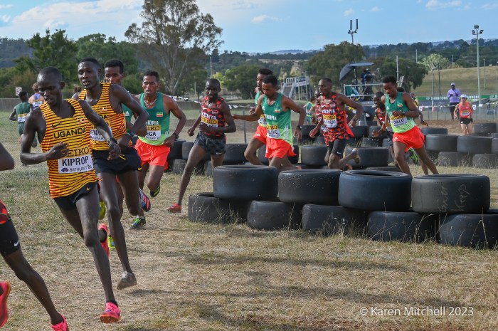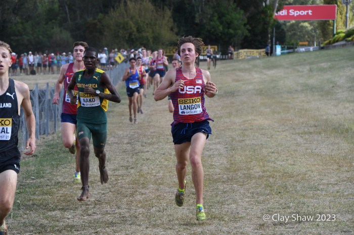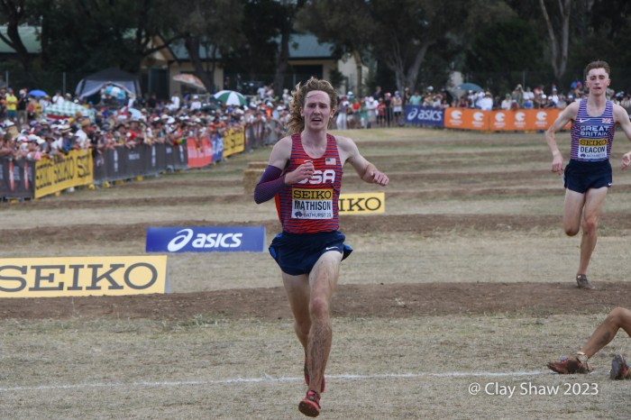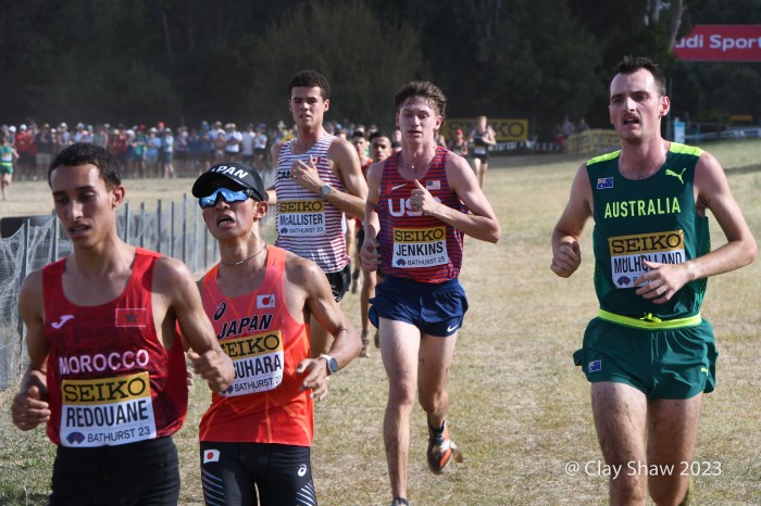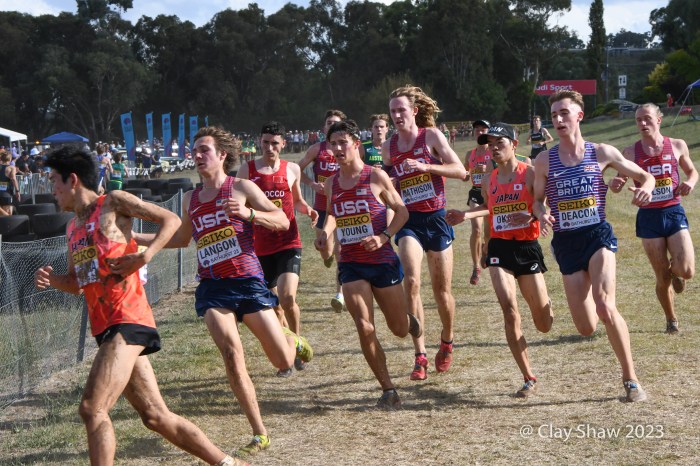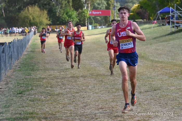 Bathurst, Australia, February 18, 2023, World Cross Country Championships at the Mount Panorama Motor Racing Circuit—Emilio Young from Newbury Park, CA who won in Richmond, VA, was the first non-East African runner at World XC. He was happy, finishing with gusto and a big smile. He was 16th in 26:03 and was soon followed by teammates Marco Langon of Raritan, NJ (19th), Max Sennes of Big Bear, CA (21st), Kole Mathison of Carmel, IN (25th), Micah Wilson of St Charles, IL (27th), and Evan Jenkins of Camas, WA (53rd). It was the first USA U20 men’s medal since 1982. Kenya edged Ethiopia 21 to 22 in team scoring. Uganda who had three men in the top eleven, did not have a fourth athlete due to visa problems. The USA scored 34 points to earn the bronze, with South Africa and Great Britain rounding out the top five.