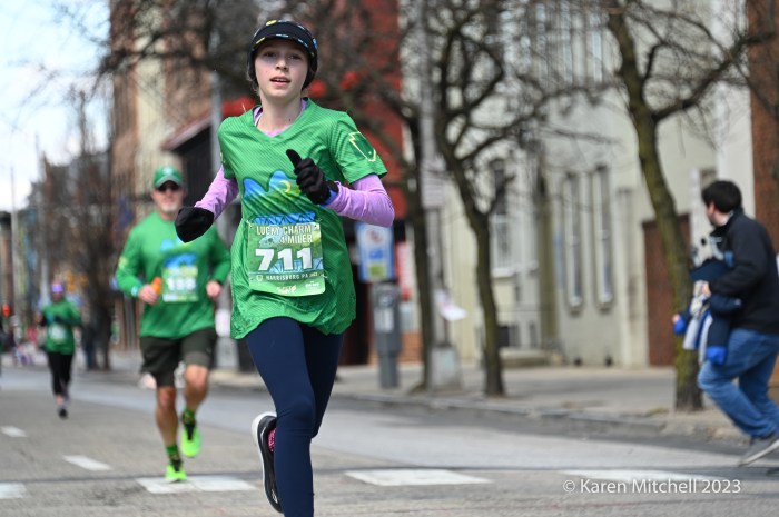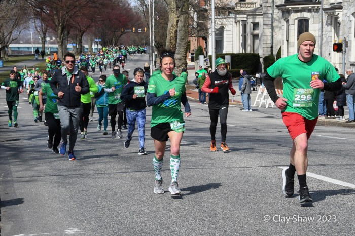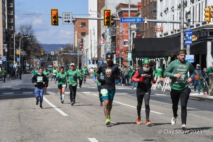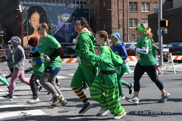 Green-clad runners start the 7th edition of the Lucky Charm 4 Miler. One of Harrisburg’s murals keeps an eye on things.