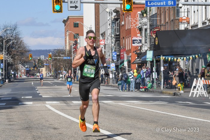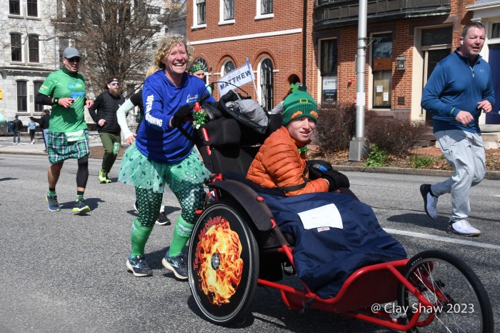 Joe and Woody Woodworth of Kirkville, NY finish down Second Street. Joe is runner/owner/artist of USA Racing, which makes custom swag, apparel, and accessories for events, including several in Harrisburg and York.