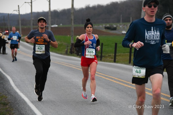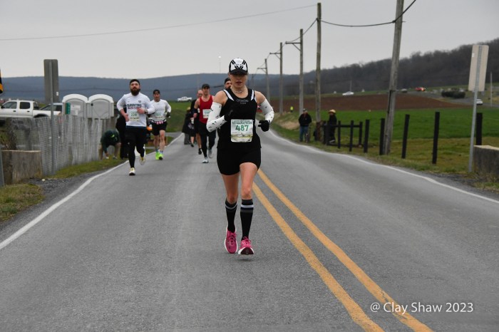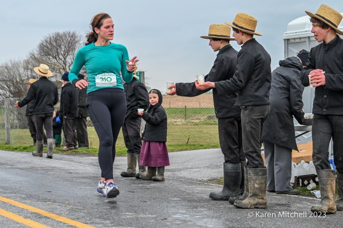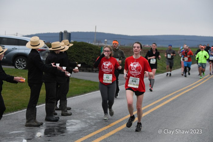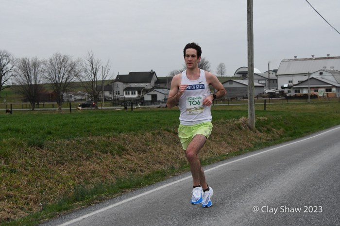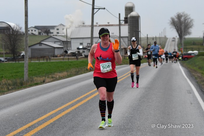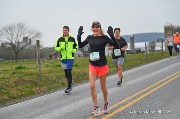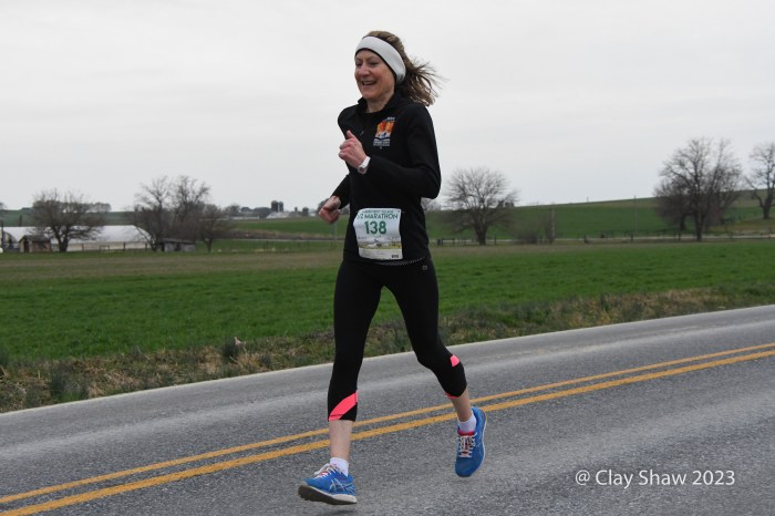 Madelena, consistent on her times on the hilly Amish Country course, ran 1:30:01 to repeat as champion. Kaitlin Gresh of Reading was second in 1:30:29. Meg Griffith of Manheim and the F & M Track Club was third in 1:3034. Meg was second in 2022, and ran nearly two minutes faster in 2023; funny how that works out. Betty Wittrig of Port Matilda, PA was sixth overall and top master in 1:39:54. Garden Spot Village is a home for elderly, and starts their master categories at 50. No matter for Wittrig, as she is in the 55-59 group. Karen Lam-Duckett of York was seventh overall in 1:40:13, and for editorial purposes was second master. Karen is the race director of the York White Rose Run coming this fall on September 23, 2023. Anabelle Broadbent of Perkasie, another 55-59 star earned the race’s second female master award.