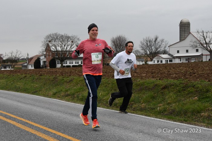 Scott Savage of Exton, PA had a big lead that he never relinquished, winning in 1:18:58. Ramsey Sybel of Mt Joy, the 2022 champion, was second in 1:21:50. Eric Rowits of New Holland earned third with a 1:22:48. Andy Evans of West Chester was fourth overall and for editorial purposes, the first master in 1:22:56. Scott Bartucca of Jackson Heights, NY was seventh and second master in 123:57. The top fifty year old, recognized as masters by Garden Spot Village were Mark Hanna of Bethlehem in 1:26:58, he was fifteenth overall, and Patrick Donadio of Bensalem in 129L:42, who was twentieth overall.