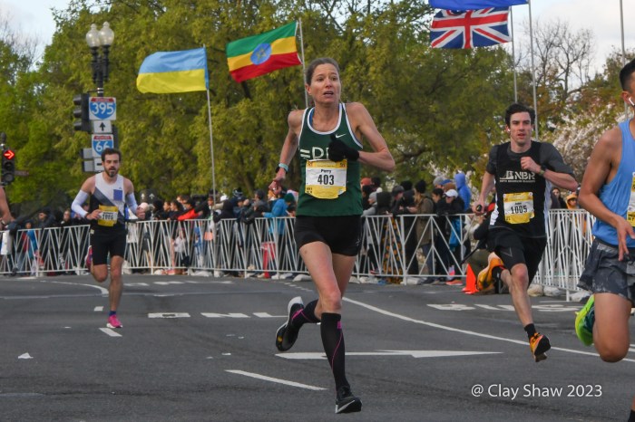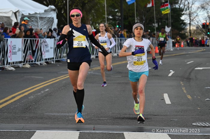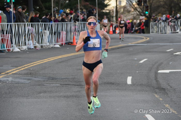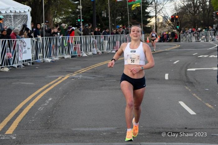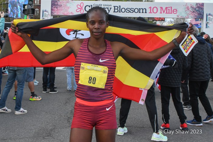 International runners earned the overall wins as Sarah Chelangat of Uganda broke away from a 12-woman pack just after mile five. Chelangat ramped up the pace with two straight 5:06 miles, and the race for first was over. Chelangat toured Hains Point alone, and won it in 52:04 with a 33-second margin over an exciting race for the USA championships.