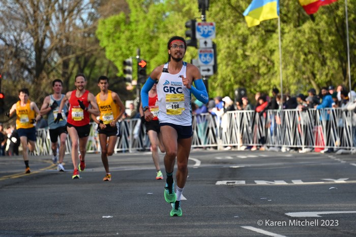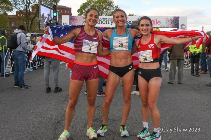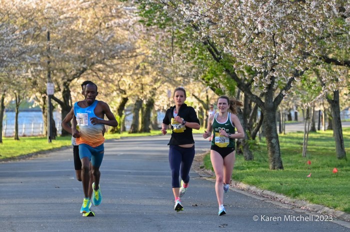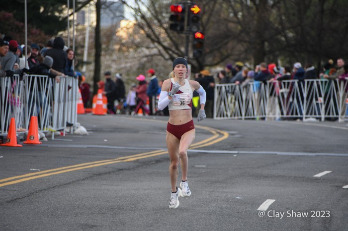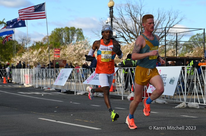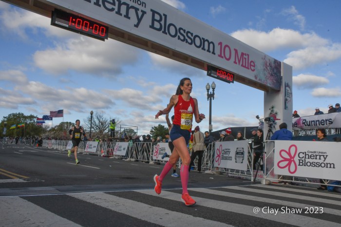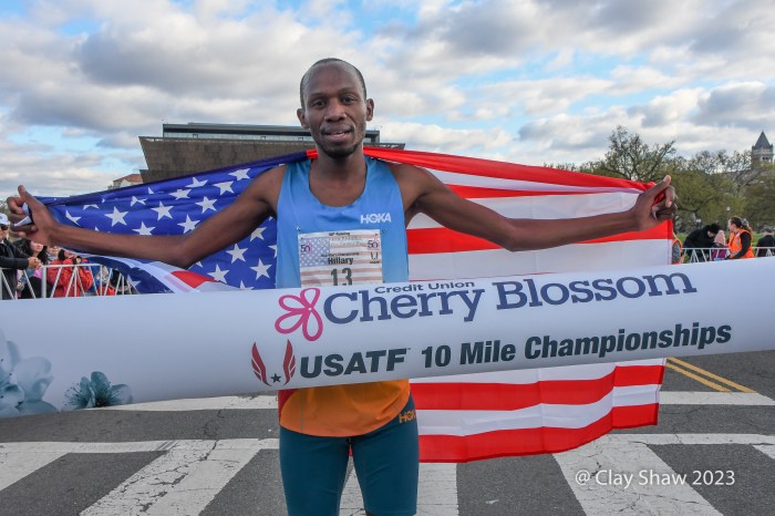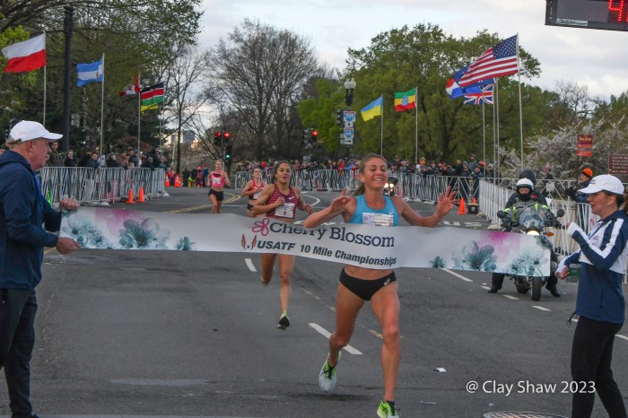 Washington, DC, April 2, 2023, 50th Anniversary Credit Union Cherry Blossom 10 Miler—History was on display and history was made in DC in the 50th running of the Credit Union Cherry Blossom 10 miler. The race started in 1973 on April Fool’s Day with just over a hundred runners. In 1983 Greg Meyer of Michigan won the race in 46:13 and went on to win the Boston Marathon; his time stood for 40 years until Hillary Bor of Colorado Springs finished this year’s race in 46:11. The race served as the USATF 10-Mile Championships.
