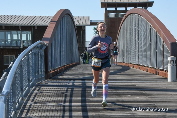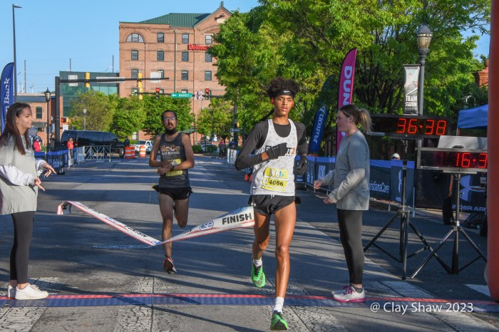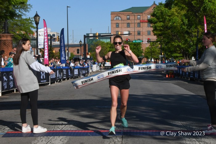 Lauren Jean Fish of Townsend, DE, known as “LJ” has happy to break the tape in the first ever road race win, with a 1:30:48 in the half marathon. Jason Farber of Baltimore, on the Falls Road Running Team broke the men’s tape in 1:19:24.
