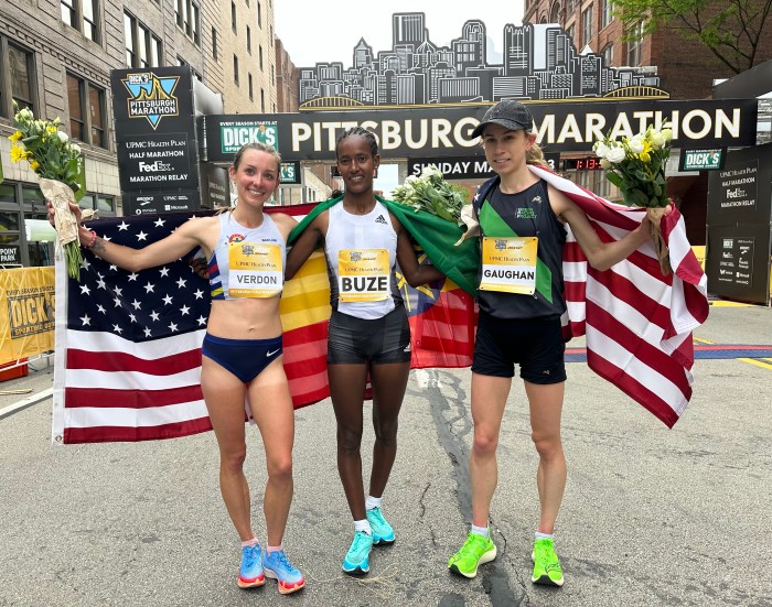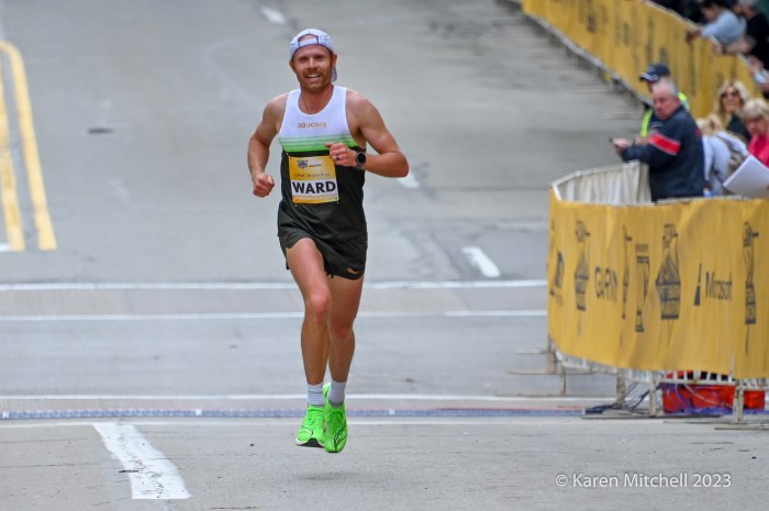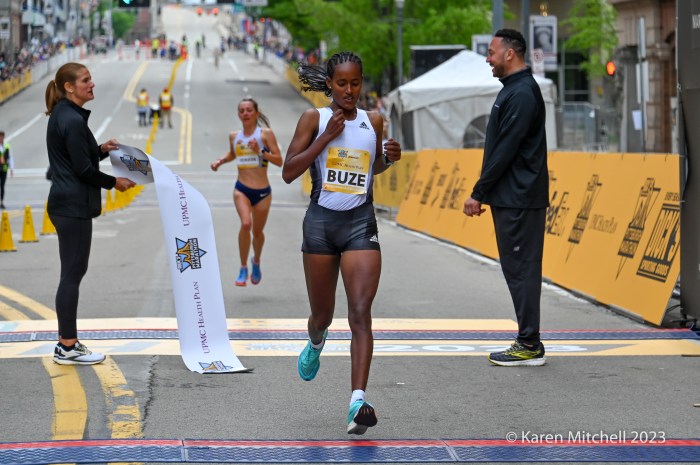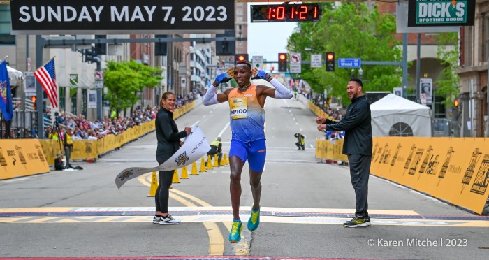 Pittsburgh, PA, May 7, 2023—Wesley Kiptoo of Kenya defended his title at the UPMC Health Plan Pittsburgh Half Marathon and lowered his course record to 1:01:21. Kiptoo, who ran collegiately at Iowa State, won easily.