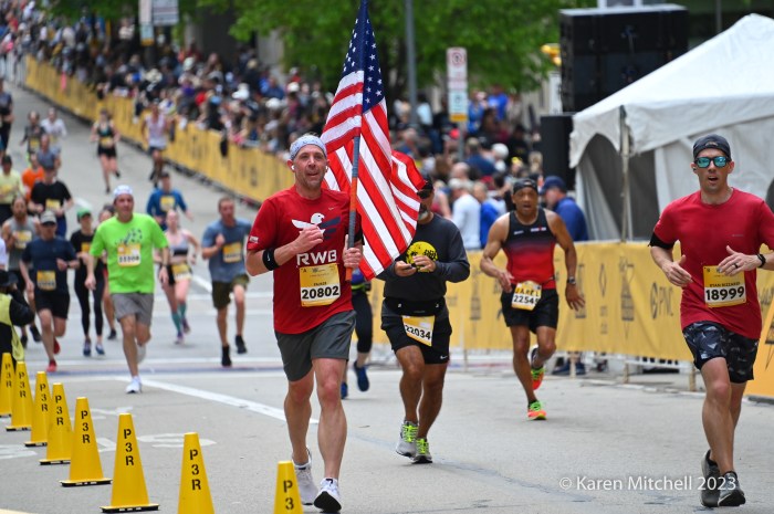 Jeff Nicolella of Washington, PA runs 1:45:37 with USA flag.