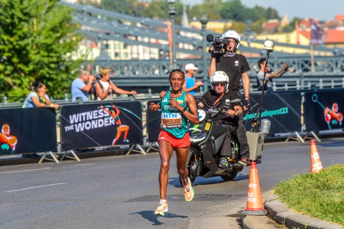 At Heroes’ Square at 32k, four Ethiopians led the field and they were impressively ramping it up. Amane Beriso Shankule, the Ethiopian record holder (2:14:58) and second at 2023 Boston Marathon, began to take charge. At 34k Tshey Gemechu just stopped, done. The three remaining Ethiopians were racing, and soon Gotytom Gebreslase was dropping back on the Chain Bridge. On the Buda side of the Danube, Beriso (Shankule) began to break away from Yalemzerf Yehualaw and ran alone in front.