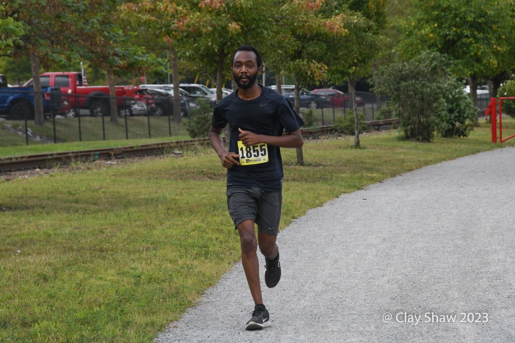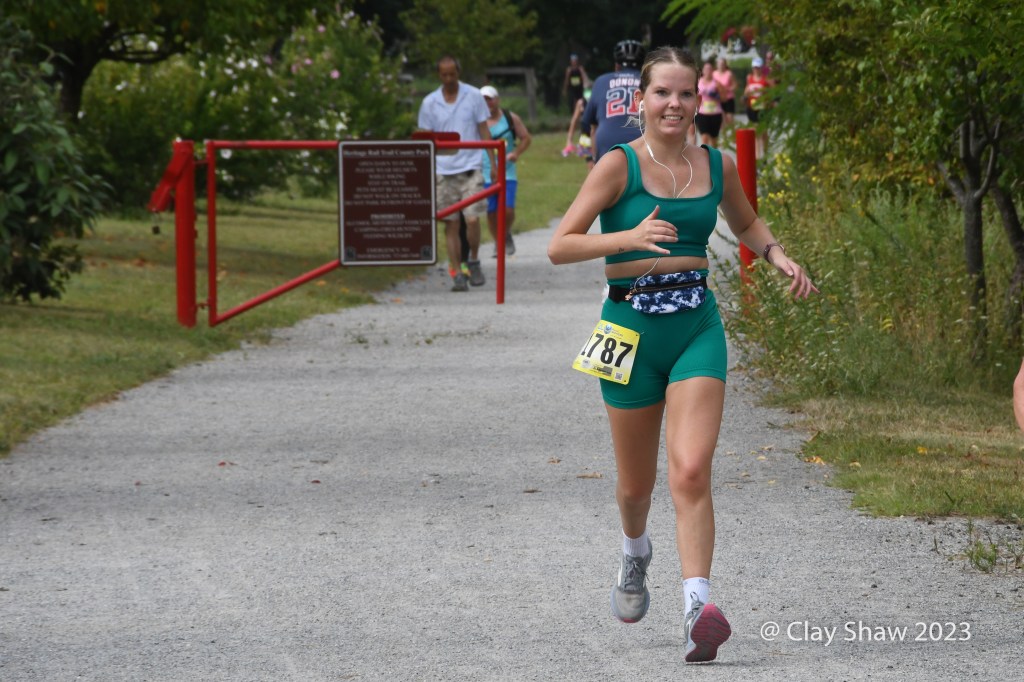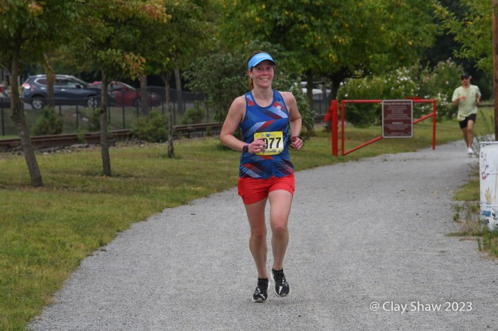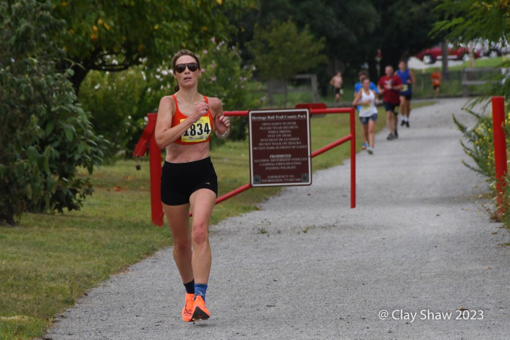 Alexander Loper and Ty Stump of Camp Hill had a huge lead by Glatfelter Station (near mile marker two), so I took a few pictures there and headed towards York, as to not miss their finishing kicks. The rail trail bends right after crossing Grantley, and wanted to be sure that the two non-area runners went the correct way. York College put a sidewalk there that adds a bit of uncertainty at that point. Ty Stump would place second in 56:16. The top two men had a lead of nearly six full minutes on the rest of the 250-finisher field.