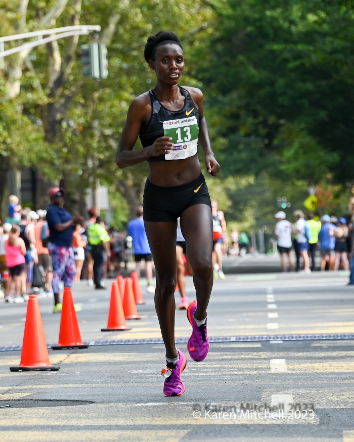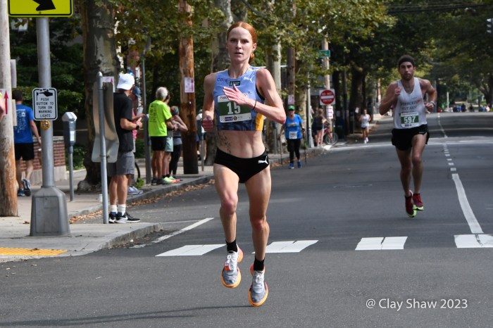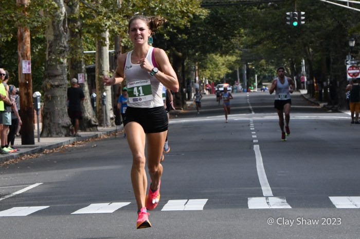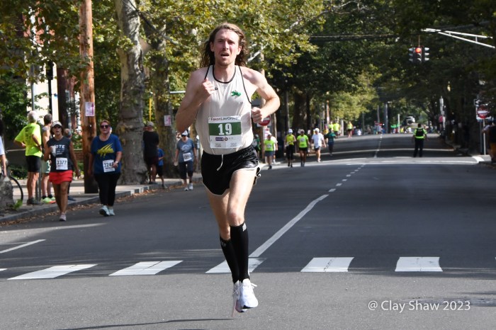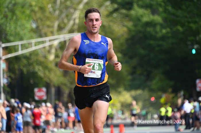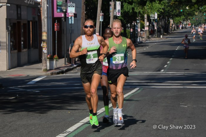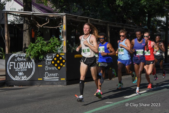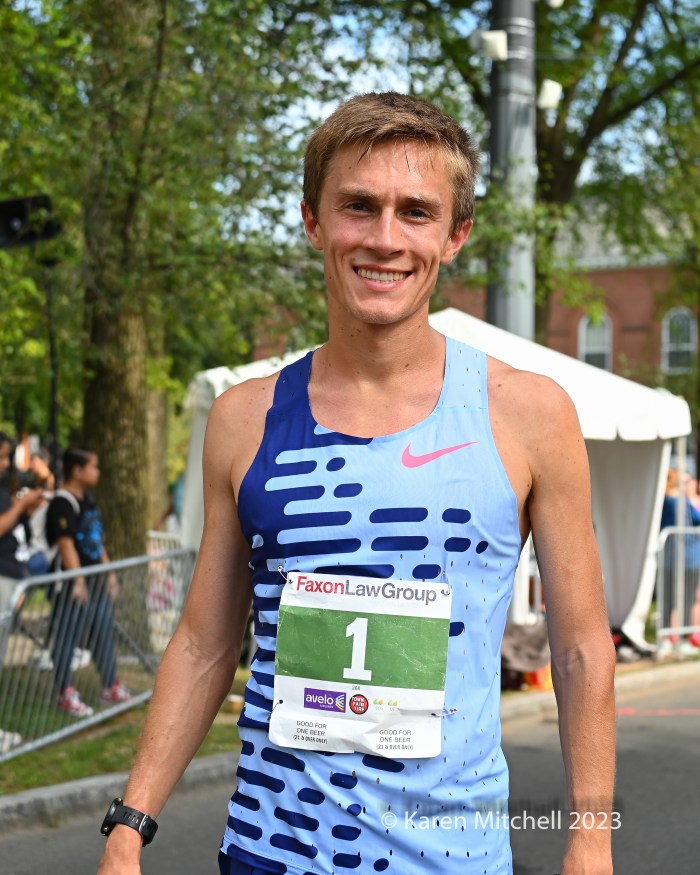 September 4, 2023, Faxon Law New Haven Road Race, New Haven, CT—Clayton Young and Conner Mantz, training partners from Provo, Utah, came to the 46th Faxon Law New Haven Road Race, the USATF 20k Championships. The pair had an exciting sprint to the finish, in which they seemed to hit the finish banner at the same time. For a few minutes, it was unclear who actually won. Young won in 59:15 and Mantz was second in 59:16. Sam Chelanga of Colorado Springs was third in 59:26. Daniel Mesfun of Flagstaff, AZ was fourth in 59:32. Futsum Zienasellassie, also of Flagstaff, was fifth in 59:36. Seven men broke the hour mark in hot and humid weather.