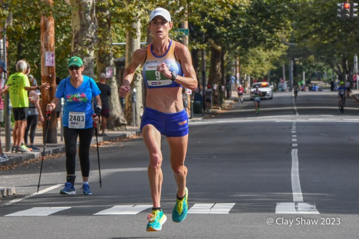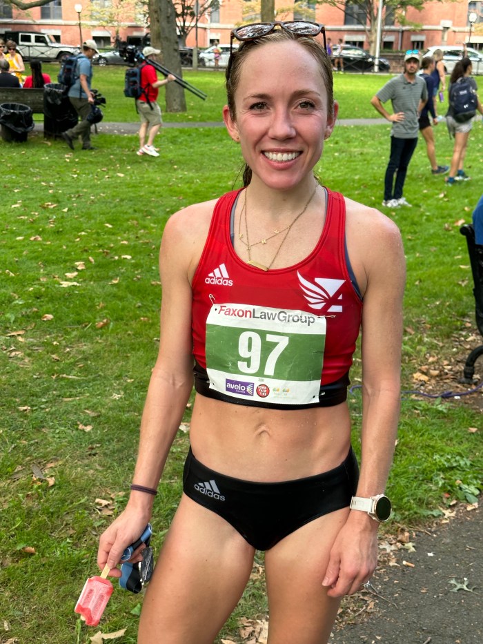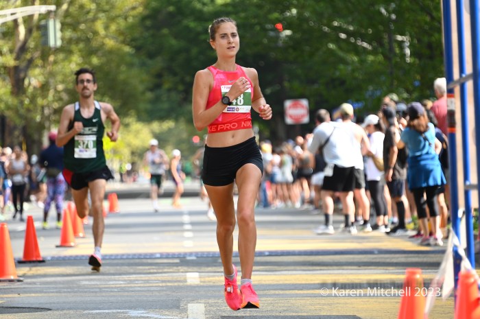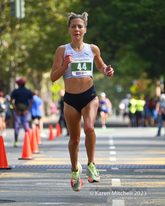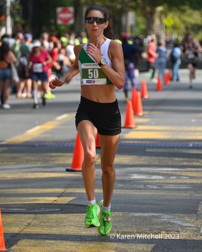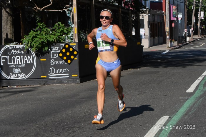 Emily Sisson of Phoenix, AZ, the USA marathon record holder, easily won the 20K in 1:06:09. Sisson has been training for a good showing in Chicago. Emily was second to Keira D’Amato in the 2022 20k, when the two pushed each other to Keira’s course record of 1:04:29. D’Amato and Sisson have broken each other’s long-distance records during the past two years. Sisson broke D’Amato’s marathon record in Chicago 2022 with a 2:18:29. D’Amato returned the favor on Sisson’s half-marathon record by running 1:06:37 at the Gold Coast Half-Marathon in Australia in July. D’Amato did not come to New Haven this year, as she recovers from last week’s World Athletics Championships Marathon in Budapest.