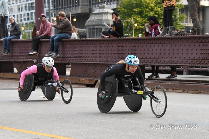 More Chicago Marathon records were set by wheelchair athletes from Switzerland. Marcel Hug, led from the start to win in 1:22:37. Catherine Debrunner had to battle American Susannah Scaroni all the way, and won in 1:38:44.