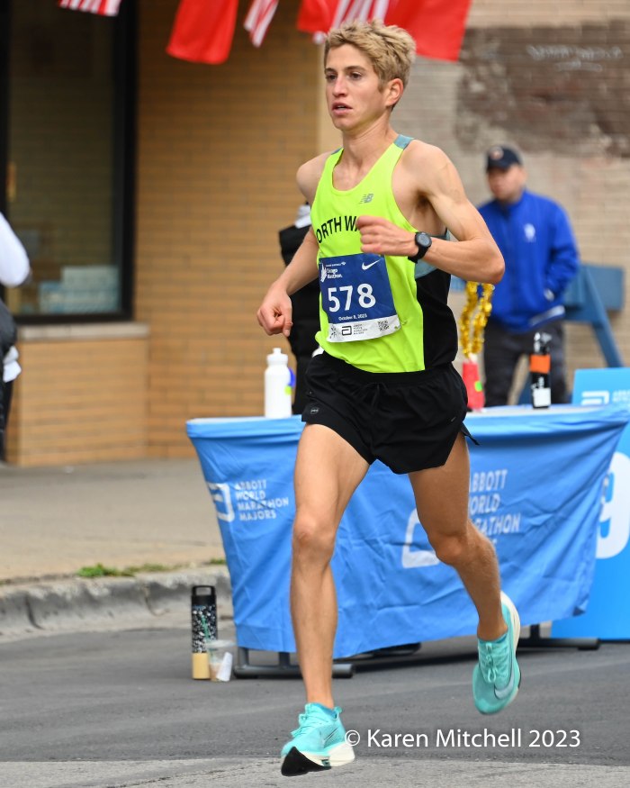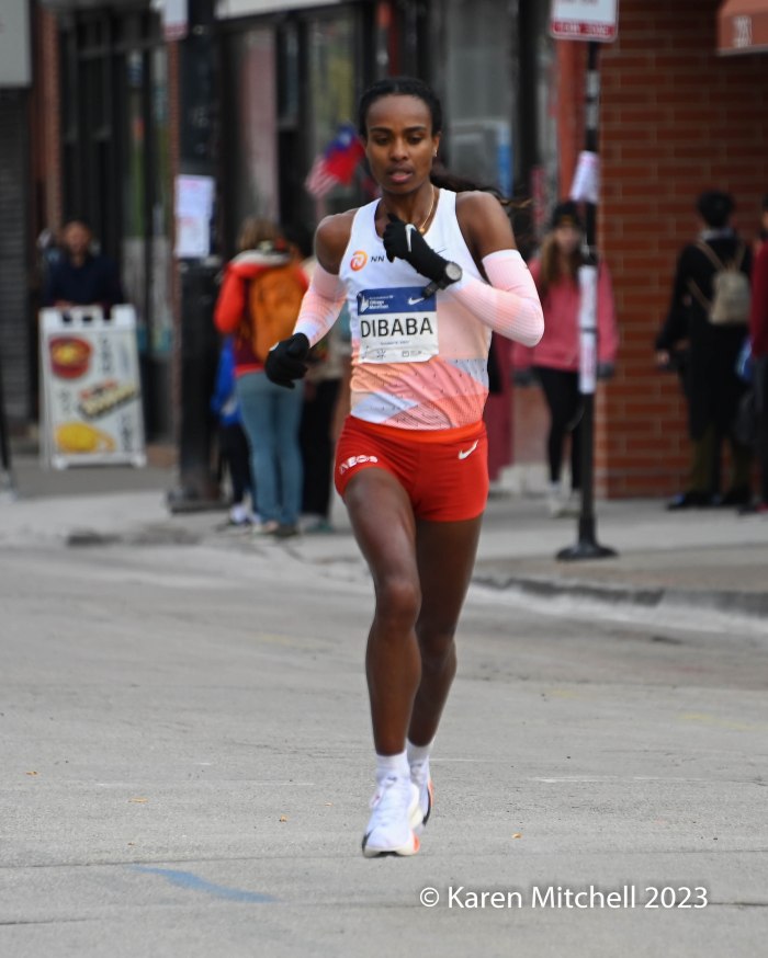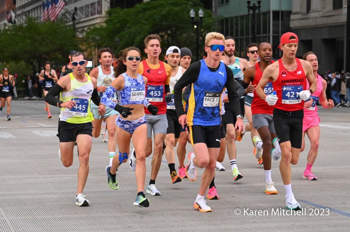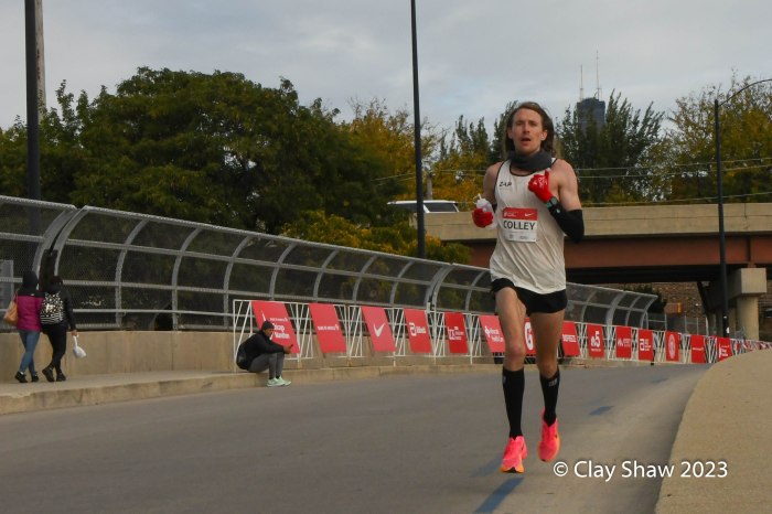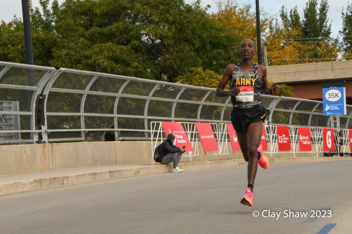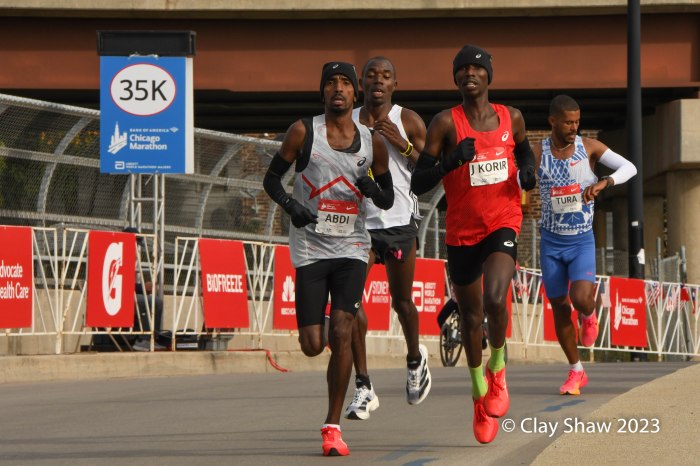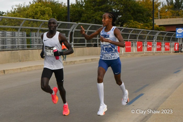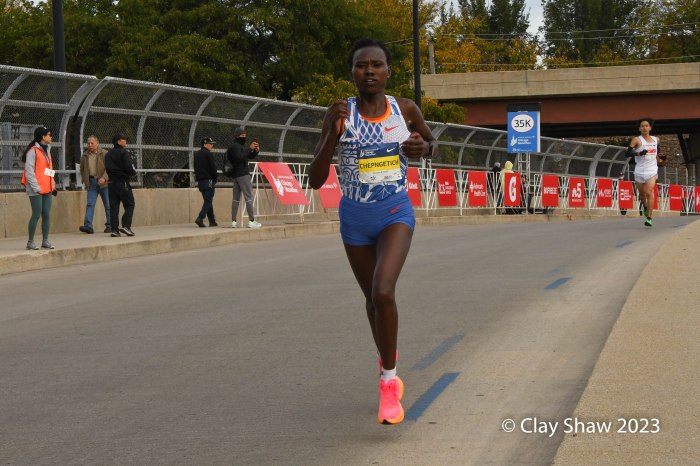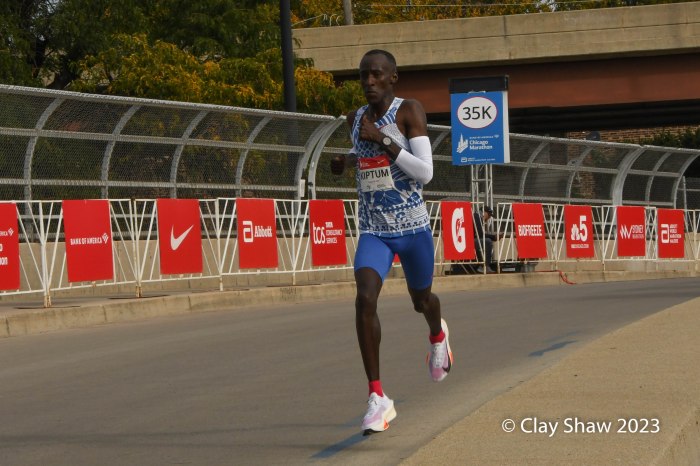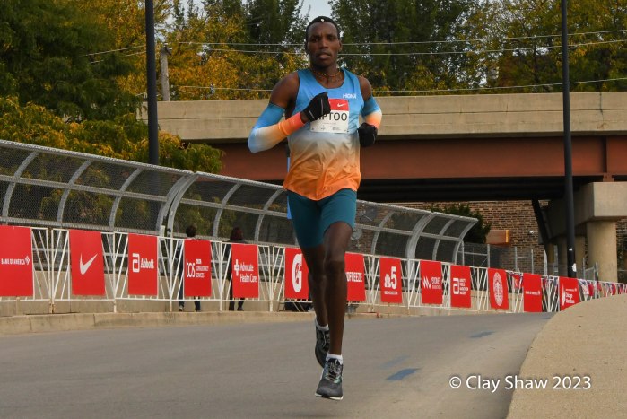 10.8.23 Chicago, IL—The 45th Bank of America Chicago Marathon was one for the ages, as several new records were set. Kelvin Kiptum, 23, of Kenya, stole the show with a new world record of 2:00:35. Eluid Kipchoge’s Berlin 2022 record of 2:01:09, was topped by Kiptum by 34 seconds. Kiptum ran the first half in 1:00:48, and ran a faster second half, joined by Daniel Mateiko making his marathon debut. Mateiko, who had several sub-hour half marathons but no marathon finishes, would drop out after 35K. Benson Kipruto, the 2022 champion, bettered his time by 22 seconds to finish second in 2:04:02. Bashir Abdi of Belgium, who has Olympic and World Champs Marathon bronze medals, would also be third in Chicago, in 2:04:32. John Korir of Kenya was fourth in 2:05:09. Seifu Tura of Ethiopia, the 2021 Chicago champ, was fifth in 2:05:29.