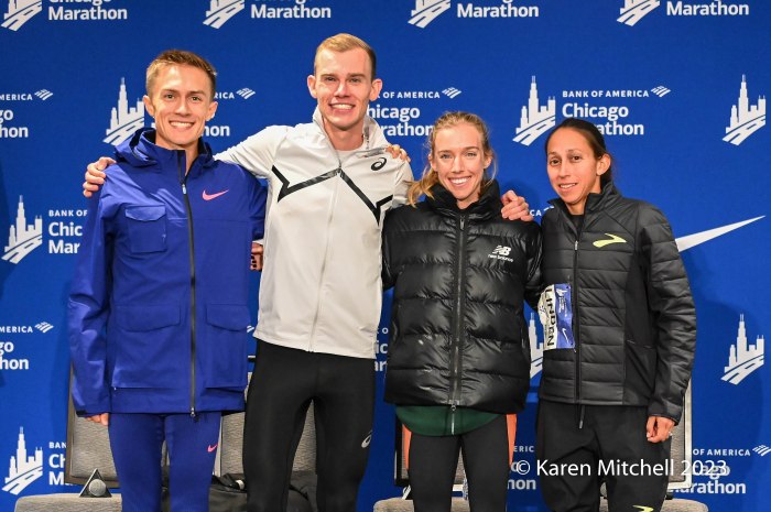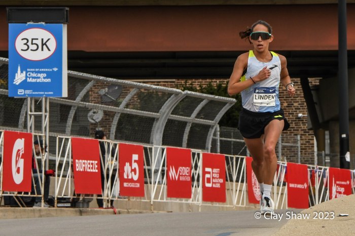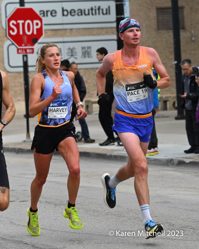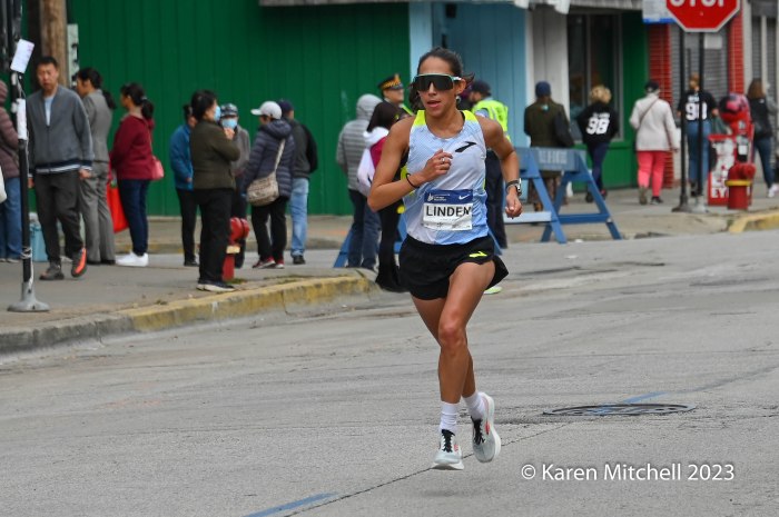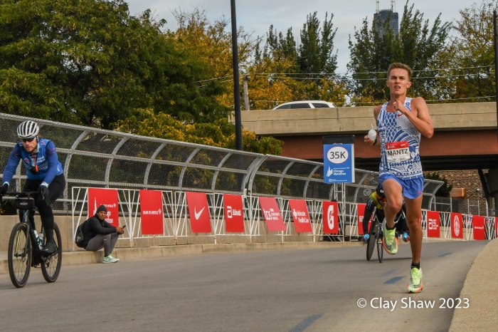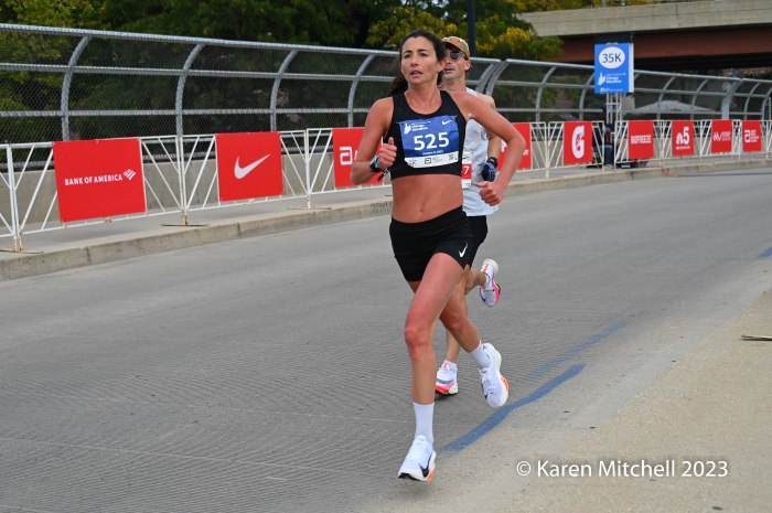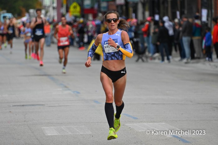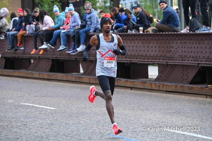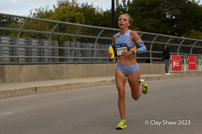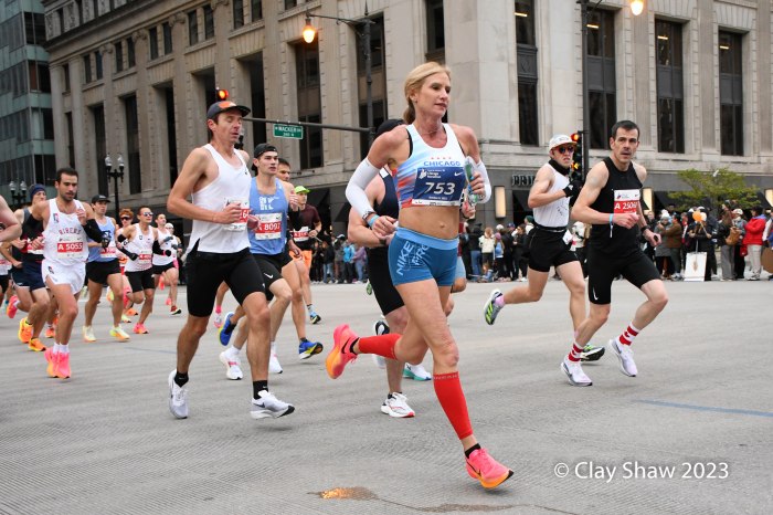 10.8.23 Chicago, IL—The 45th Bank of America Chicago Marathon was one for the ages, as several new records were set. Kelvin Kiptum, 23, of Kenya, stole the show with a new world record of 2:00:35. Eluid Kipchoge’s Berlin 2022 record of 2:01:09, was topped by Kiptum by 34 seconds. Kiptum ran the first half in 1:00:48, and ran a faster second half, joined by Daniel Mateiko making his marathon debut. Mateiko, who had several sub-hour half marathons but no marathon finishes, would drop out after 35K. Benson Kipruto, the 2022 champion, bettered his time by 22 seconds to finish second in 2:04:02. Bashir Abdi of Belgium, who has Olympic and World Champs Marathon bronze medals, would also be third in Chicago, in 2:04:32. John Korir of Kenya was fourth in 2:05:09. Seifu Tura of Ethiopia, the 2021 Chicago champ, was fifth in 2:05:29.