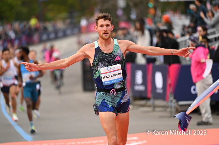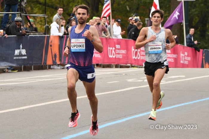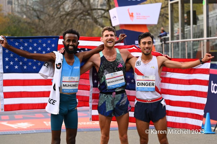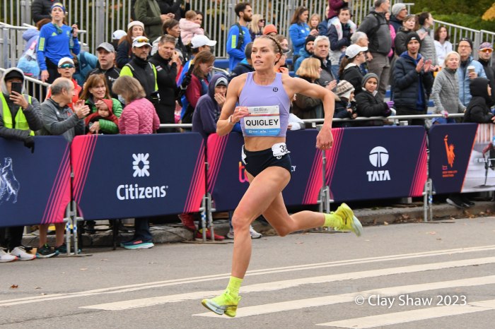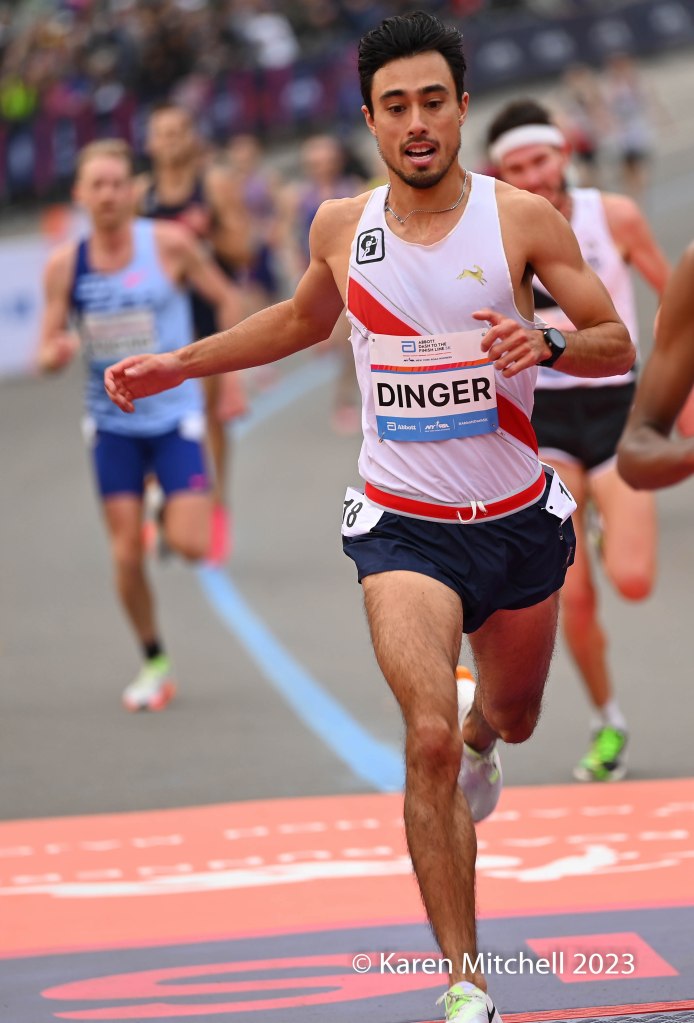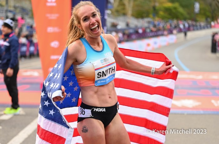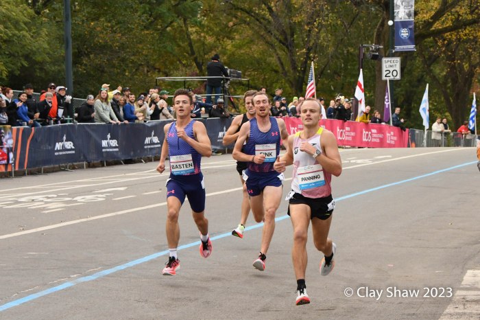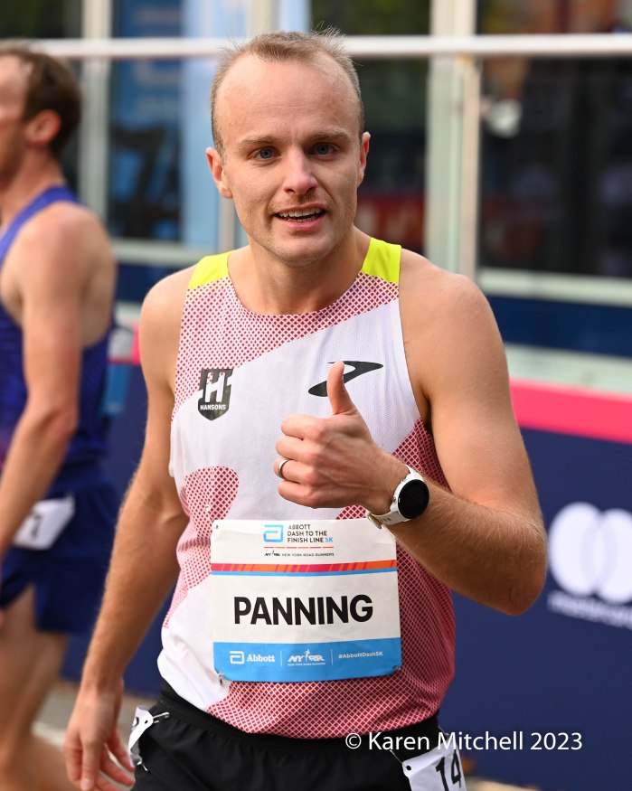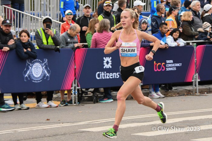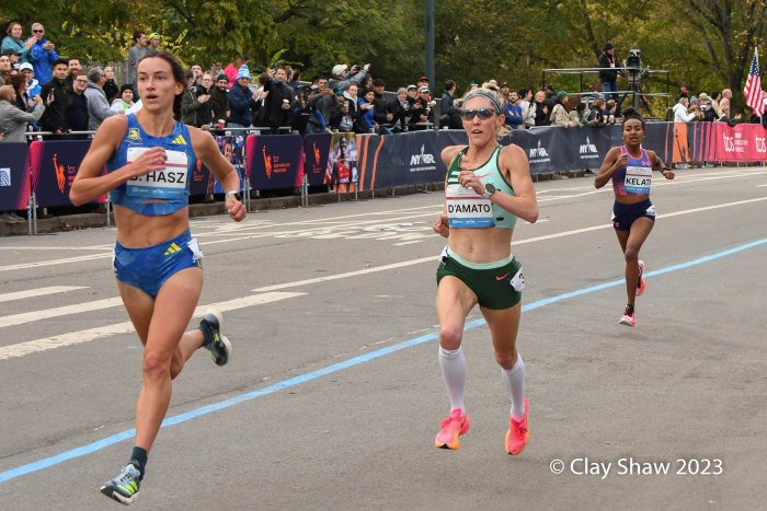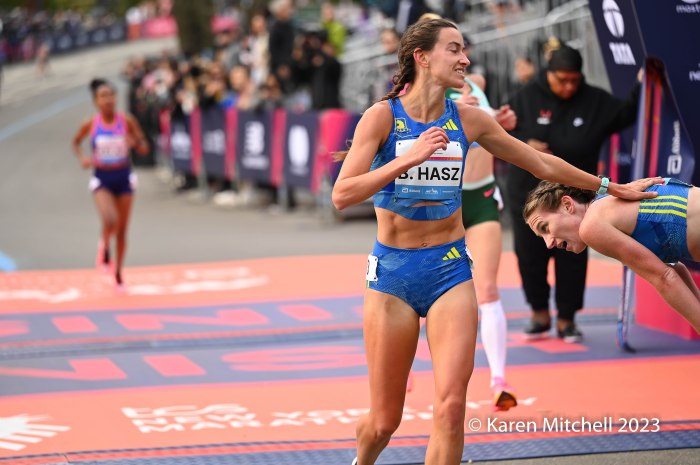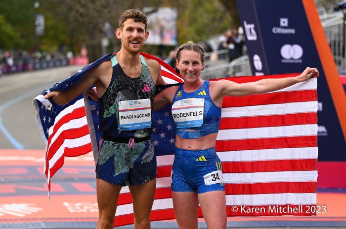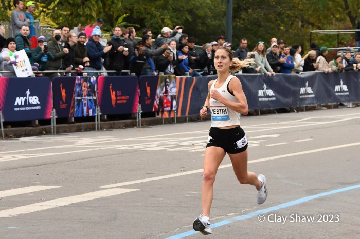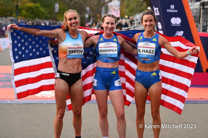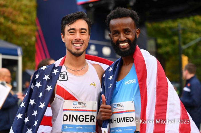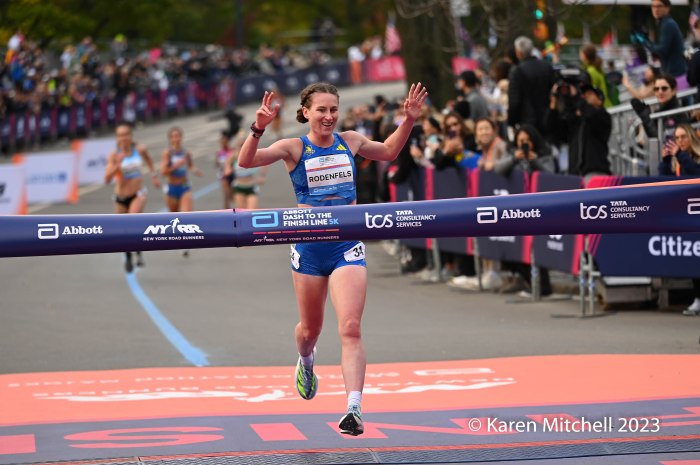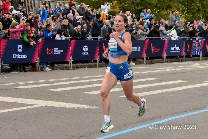 November 4, 2023, New York, NY—Annie Rodenfels of Boston has been on a roll and recently got married. In NYC she won the USATF 5K Road Championships, also known as the Abbott Dash to the Finish Line, in 15:22. Rodenfels stayed smartly in the hunt after last year’s winner Weini Kelati and marathon ace Keira D’Amato had early leads. Rodenfels pushed the pace on the Central Park section to win easily. Rachel Smith of Flagstaff, AZ was second in 15:26. The 2021 Tokyo Olympian was delighted with her podium finish. Equally delighted was third place finisher and Rodenfels’ BAA teammate Bethany Hasz, who ran 15:27. Marathon runner and USA half marathon record holder Keira D’Amato of Midlothian, VA was fourth in 15:28, as she begins her build-up for the Orlando Olympic Marathon Trials. Last year’s champ Weini Kelati was fifth in 15:30.