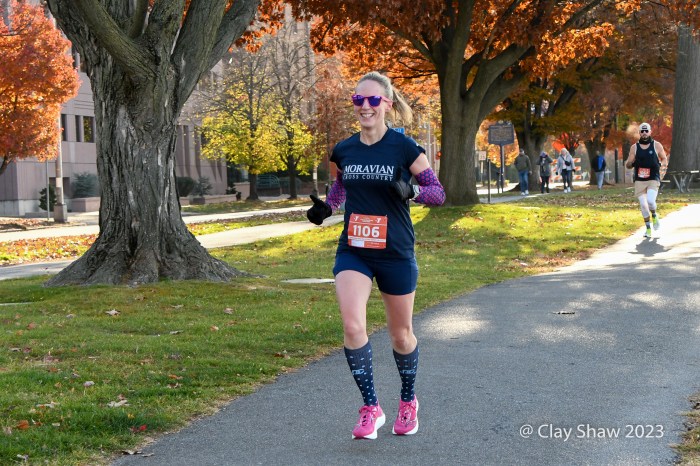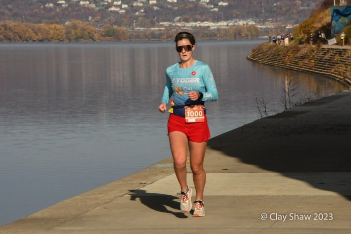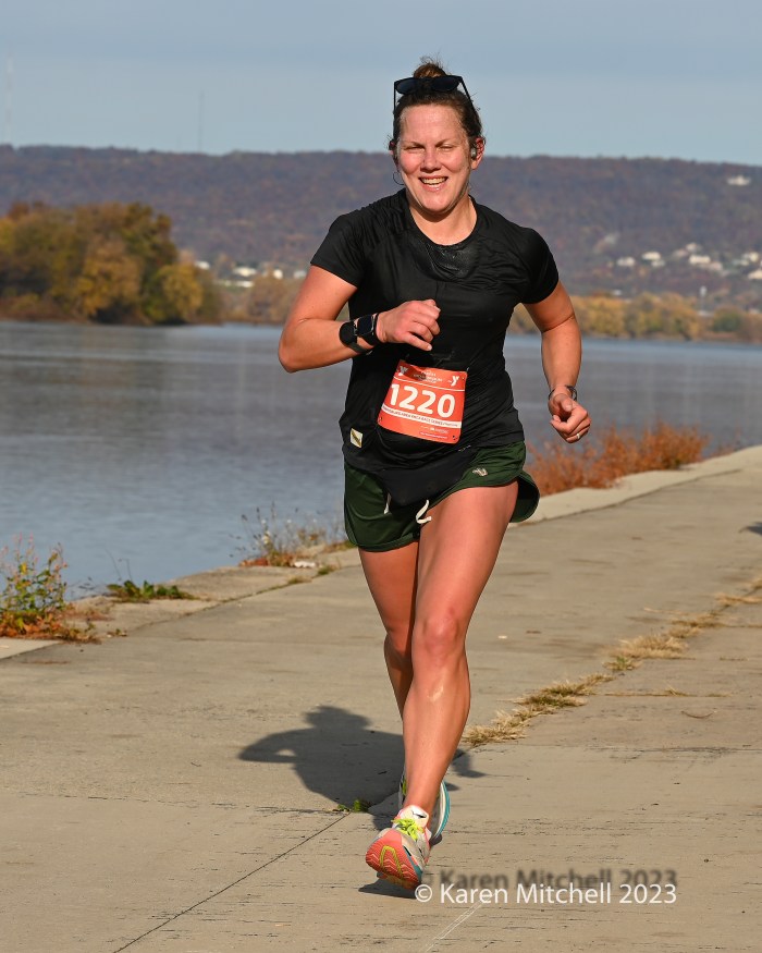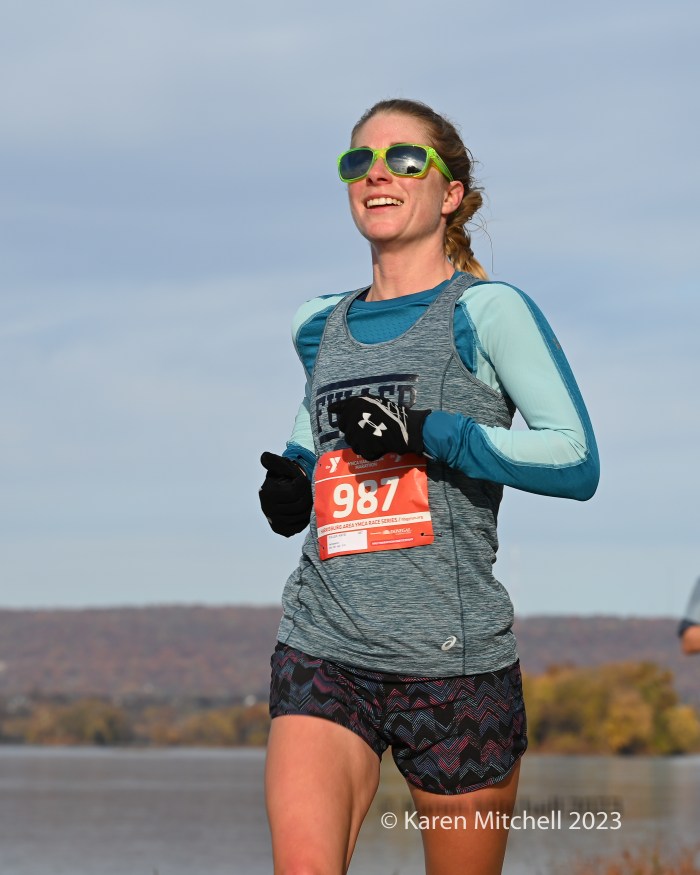 11.12.23, Harrisburg, PA—Emily Shertzer of Jonestown, PA was the top female in the half marathon, winning in 1:23:48. Teal Liu of Hershey was second in 1:25:08 and Katie Fuller of Mechanicsburg was third in 1:27:25. Only the first three men finished in front of Shertzer.