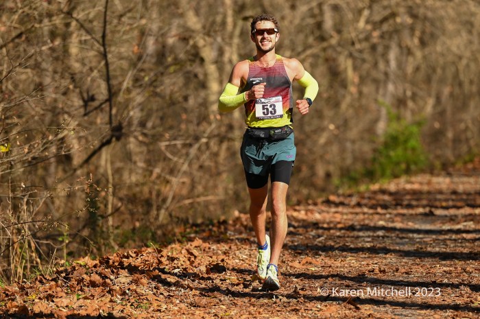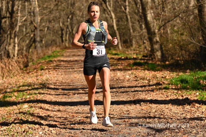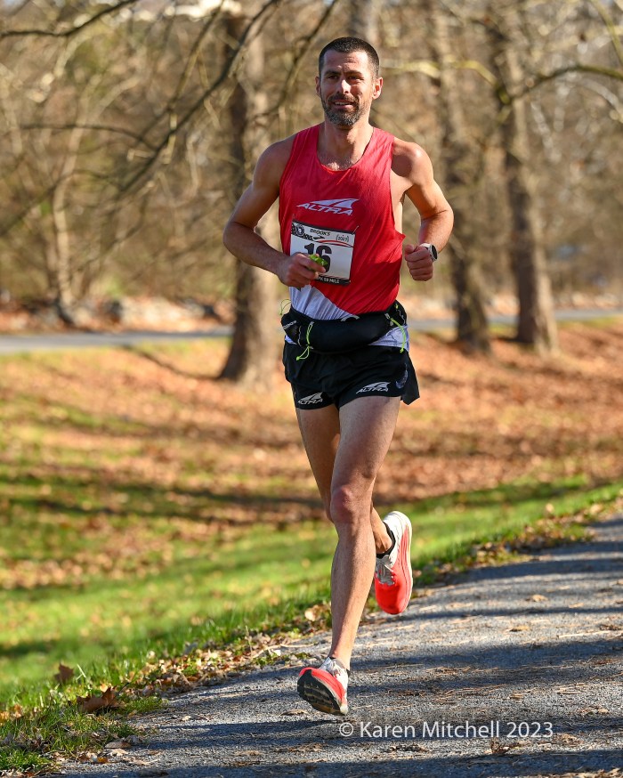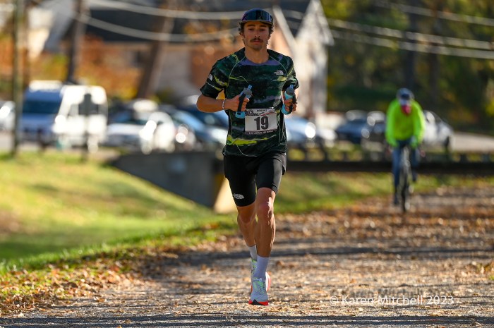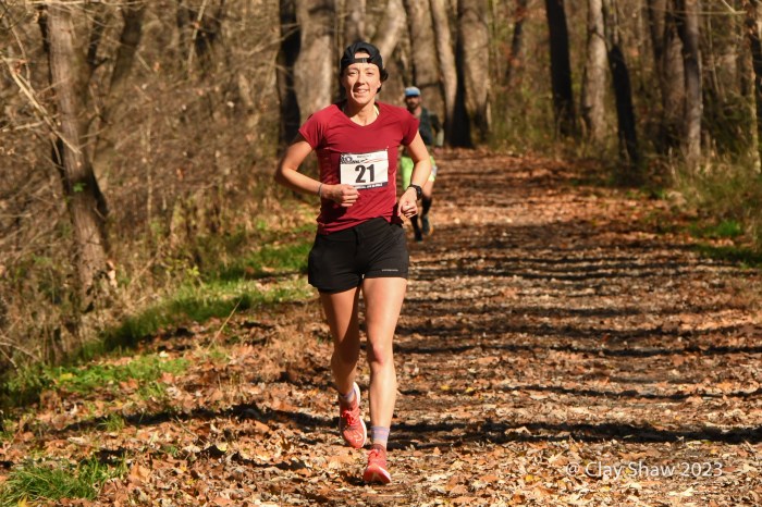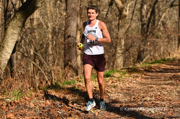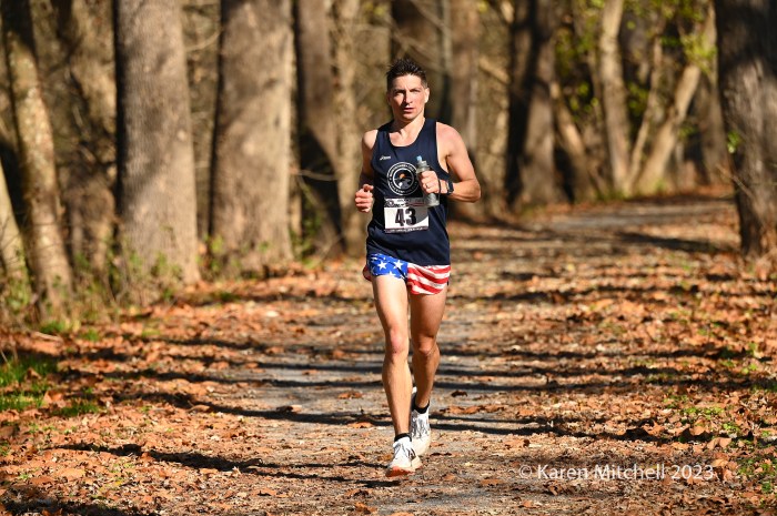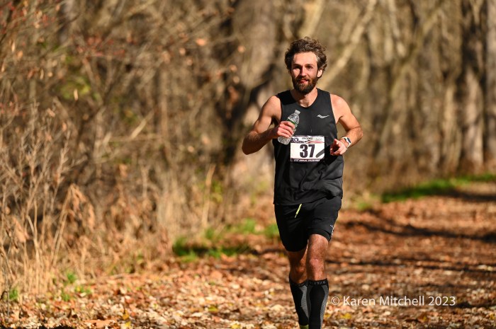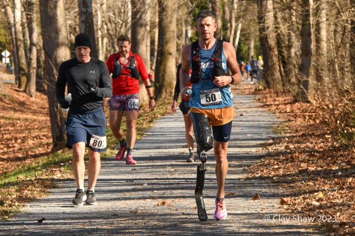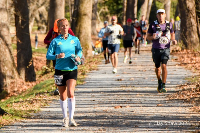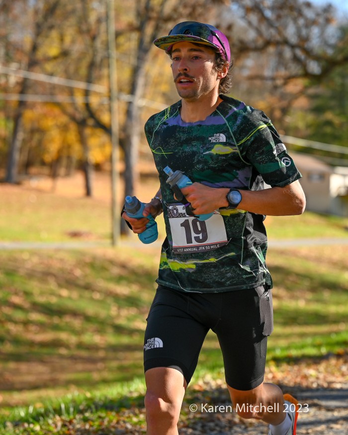 11.18.23 Boonsboro to Williamsport, MD—Seth Ruhling of Boulder, CO had his eye on the course record, but ended up with the win in 5:28:39. Ruhling won the 2019 JFK in his only other participation in the event. Ruhling is now #5 on the all-time list. Calum Neff of Katy, TX, a Canadian citizen, was second in 5:38:39. Neff had a DNF in his only other JFK wanted to set the record straight. Ryan Sullivan of Grand Junction, CO was third in 5:40:45. Jared Burdick of Fayetteville, NY was fourth in5:46:21. Geoffrey Burns of Colorado Springs, CO made it three for Colorado in the top five, in 5:55:02. The five were the only runners to break the six-hour mark in the 2023 JFK, in which 932 finished.
