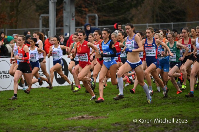 The Senior Women start the 9000 meter race at the SPAR European Cross Country Championships. Seniors isn’t the USA term, but it is used internationally for athletes born in year 2000 or earlier, 23 and up.
