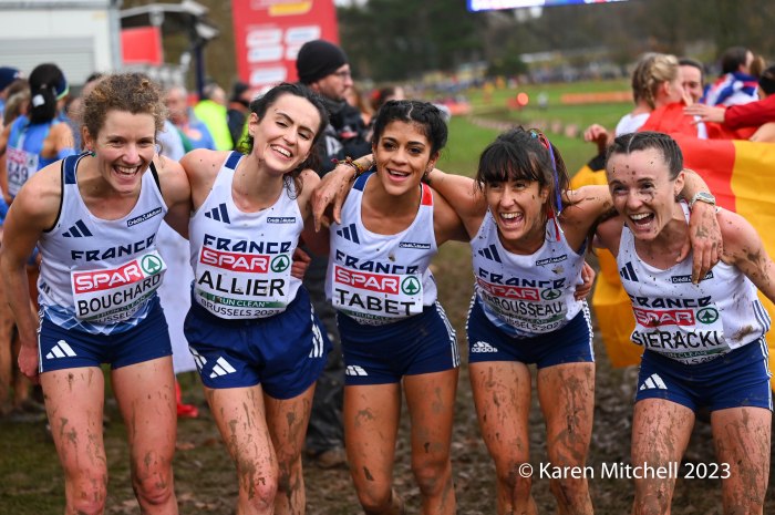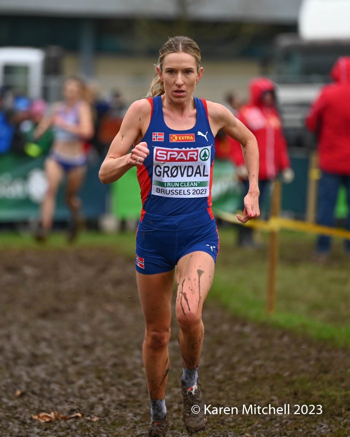 Karoline Bjerkeli Grøvdal was dominant as she won her third European XC title in a row. She won in 33:40 on the muddy 9000 meter course at Laeken Park, Brussles, Belgium.