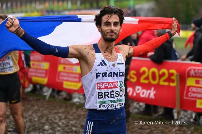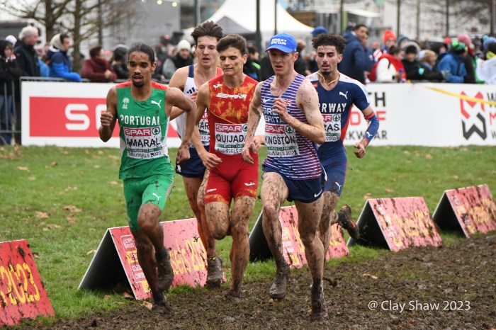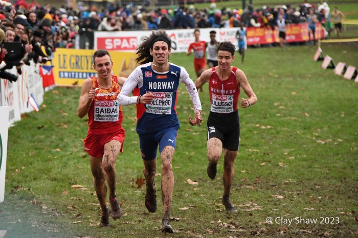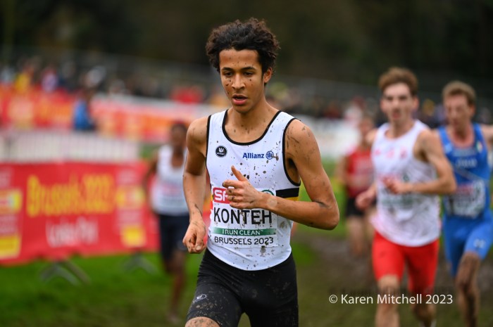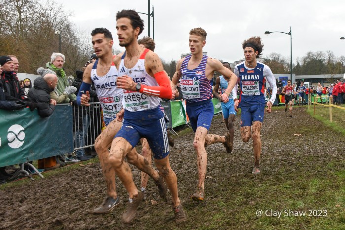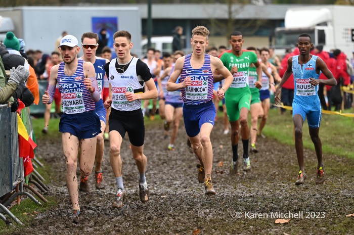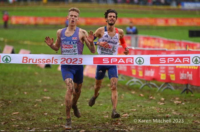 12.10.2023, Brussels, Belgium—Will Barnicoat of Great Britain won the U20 SPAR European Cross Country Championship in Turin, Italy in 2022. This year Barnicoat moved up to the U23 race and won again. It wasn’t easy by any means as he fought off a massive challenge by Valentin Bresc of France. Both men were timed at 23:42 for the 7000-meter muddy cross country course at Laeken Park in Brussels. Barnicoat’s teammate Matthew Stonier was third in 23:51, earning the bronze. Great Britain won the team gold, followed by France and Norway.