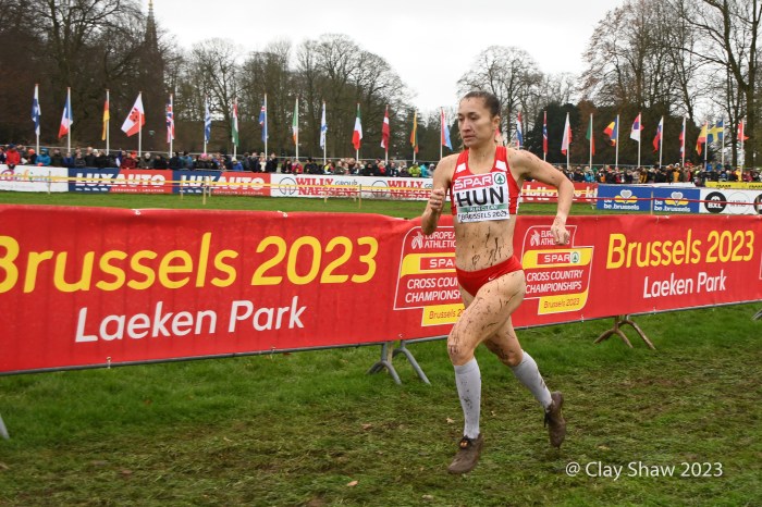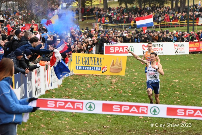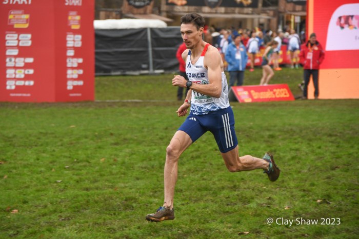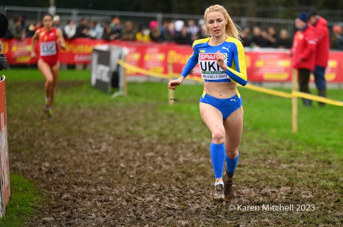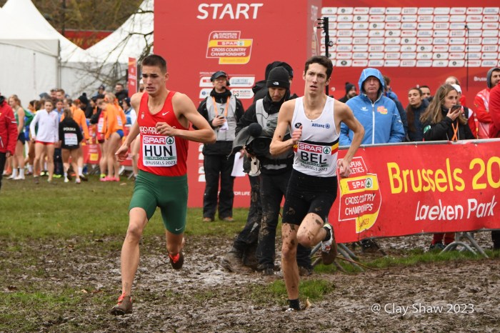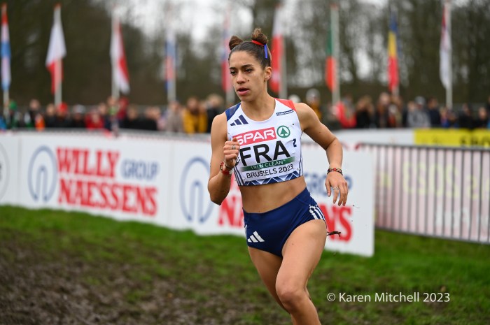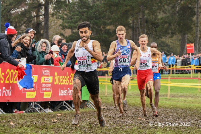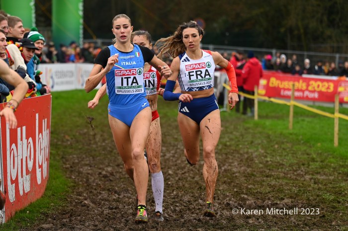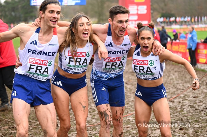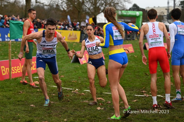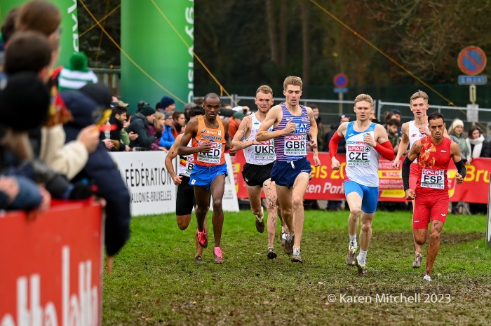 12.10.23 Brussels, Belgium—Alexis Miellet of France has performed magic before at European Cross Country, but this time he took the handoff 58 seconds down. He caught Bram Anderiessen of Netherlands and then Great Britain’s Khahisa Mhlanga. Teams could start with either a man or a woman and finish with either as well. Ms. Mhlanga had the lead for Great Britain for the final lap and was passed by French and Dutch male runners. She did hold off Italy, as Great Britain earned the bronze team medal.