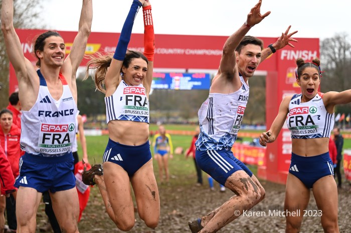 We jump for gold. Team France is the 2023 European Cross Country Champions – mixed relay.