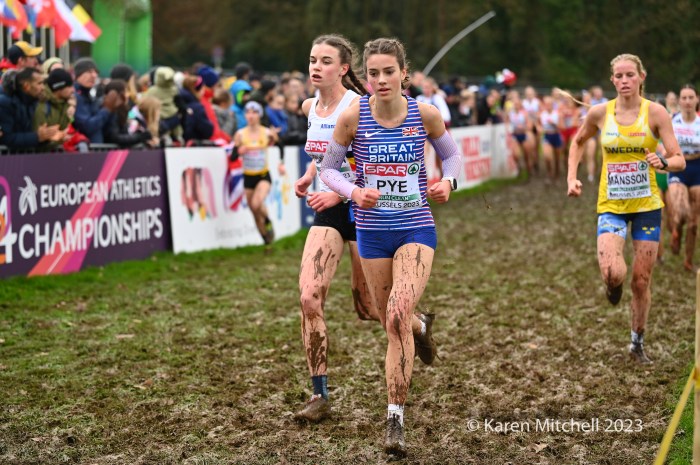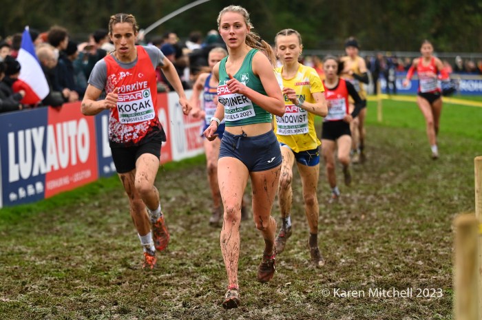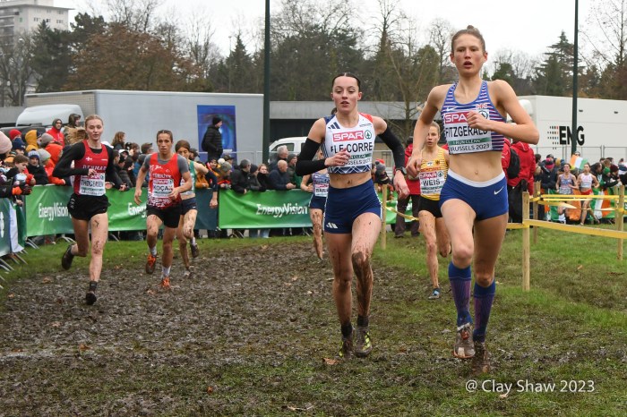 12.10.23 Brussels, Belgium—Innes Fitzgerald of Great Britain took charge early and ran away with the 5000-meter SPAR European Cross Country Championship win in 18:19. Fitzgerald led Great Britain to the team title, as fellow Brits Jess Bailey was eighth, Lizzie Wellsted was thirteenth, Katie Pye was 28th, Moli Lyons was 31st, and Zoe Hunter was 32nd.