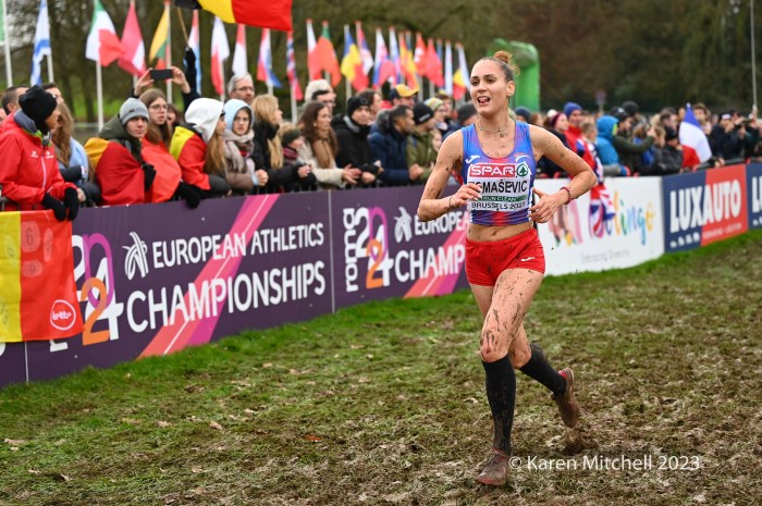 Milica Tomasevic of Serbia runs through the mud. We are hoping it’s not that muddy when we go to Serbia in March 2024 for World XC.