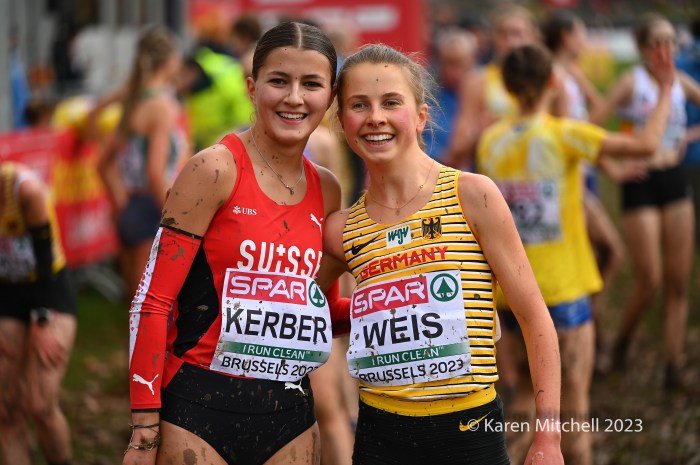 Shirin Kerber of Switzerland, and Kira Weis of Germany share a happy moment after the U20 race. Kerber was sixth and Weis was fourth.