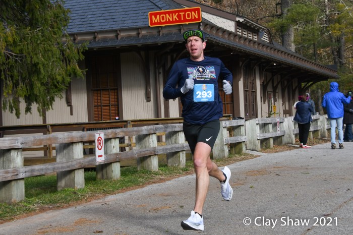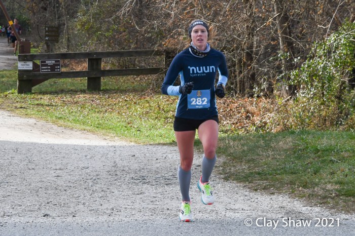 The NCR requires a level of concentration according to Rowe, “Maybe not greater concentration, but a different type of concentration. NCR has a slight incline heading out toward the turnaround, and this stretch can be challenging, especially if there is a headwind. Also, running a straight out-and-back on a rail trail without a lot of turns and landscape variation can be mentally challenging. Putting that aside, it is a very generous course that, in my experience, allows for faster times than a hilly course.